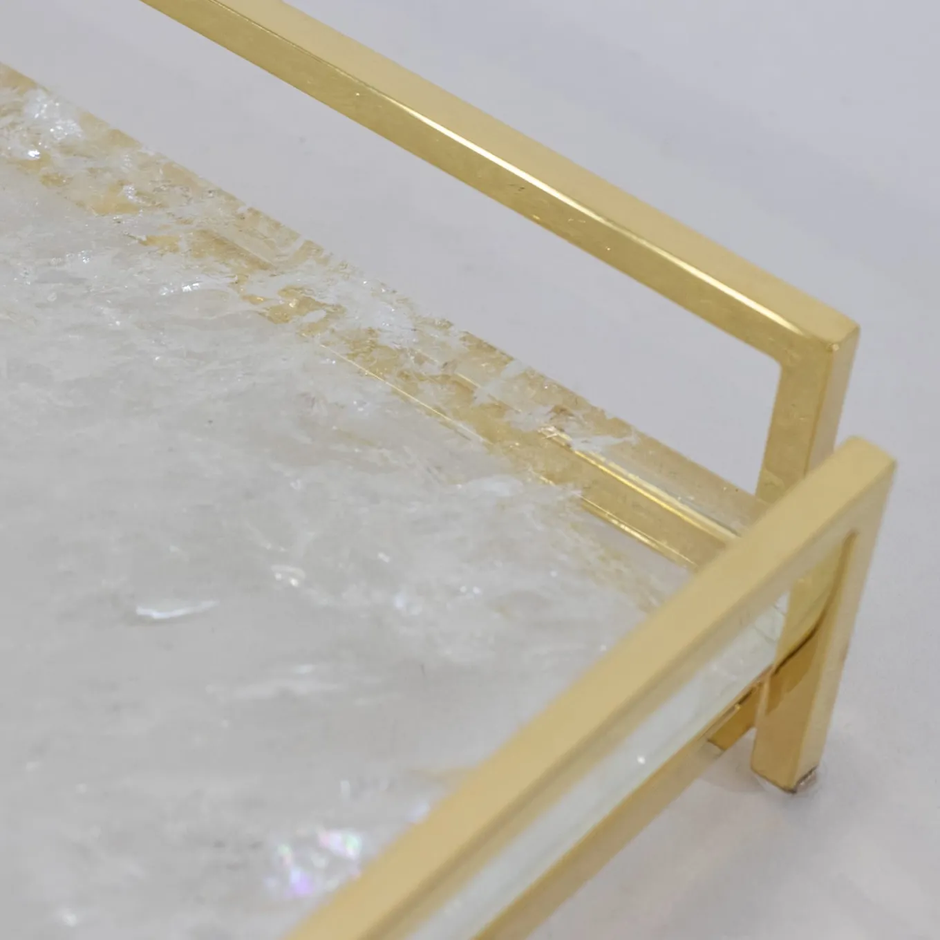 Silenzioso nelle dimensioni quanto raffinato nell’estetica, questo sublime videopoche arricchirà con un pizzico di opulenza scrivanie o tavolini moderni. La preziosità della finitura dorata che illumina tutti i profili lineari della sua struttura in ottone incontra quella della lastra di quarzo ialino, che incanta con i suoi tracciati e le sue trasparenze.
