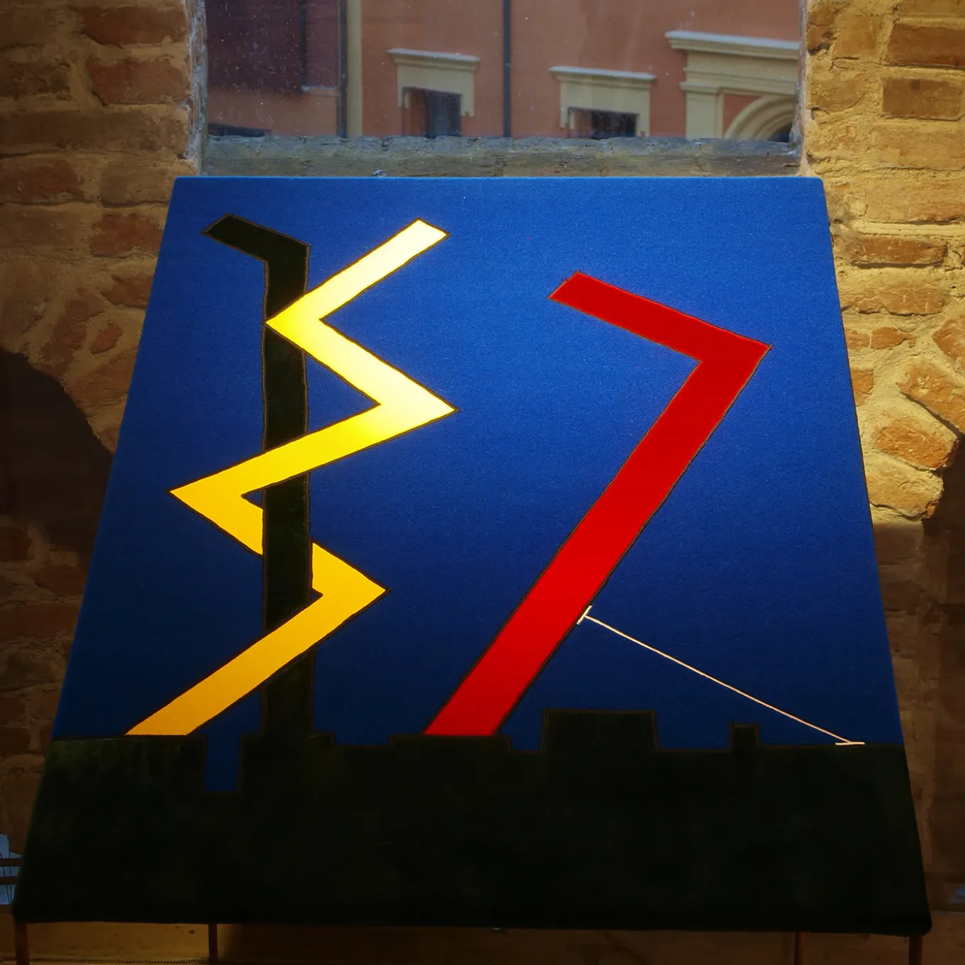 Disegnato da Ennio Nonni come riflessione immediata e suggestiva sulle moderne sfide ambientali, questo superbo arazzo è un progetto singolare abilmente intessuto dalle mani dell’artista tessile Marta Pederzoli solo con fibre provenienti da bottiglie in PET riciclate. Il paesaggio stilizzato è privo di presenze umane, raffigurando un monotono skyline urbano dal quale vibranti polilinee gialle e rosse sembrano cercare di liberarsi, stagliandosi sul solido sfondo blu.