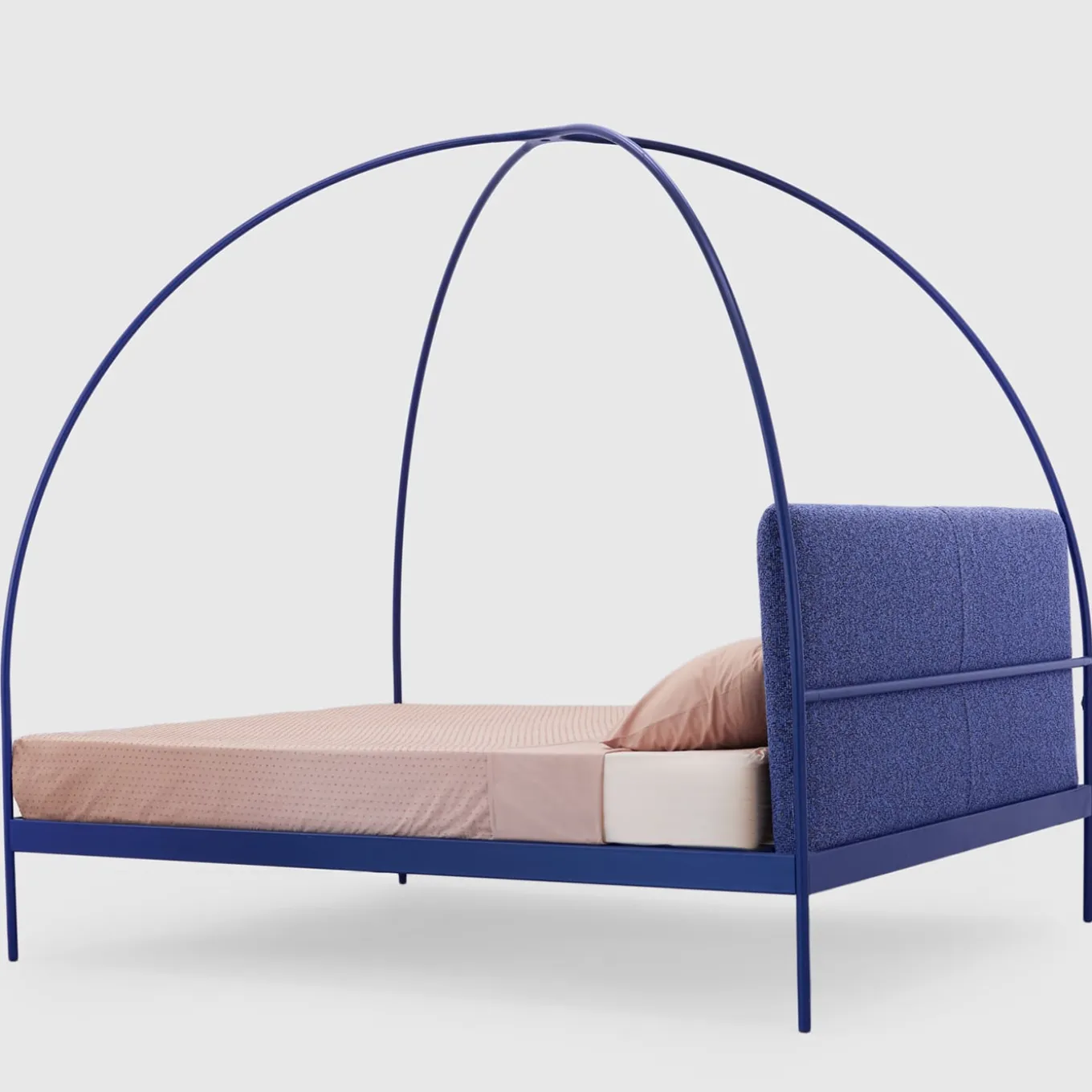 Eleganza e giocosità si fondono in questo letto matrimoniale con struttura a baldacchino a volta incrociata. Realizzata in ferro battuto blu, la struttura tubolare è costituita da una coppia di archi che incorporano i piedi e ospitano una sorgente LED proprio nel punto in cui le sue curve si intersecano. Dotato di una testiera imbottita in tinta per un maggiore comfort, il letto promette sessioni di lettura rilassanti grazie alla possibilità di attenuare la luce a piacere utilizzando i pulsanti sulle gambe posteriori. Il LED non è incluso.