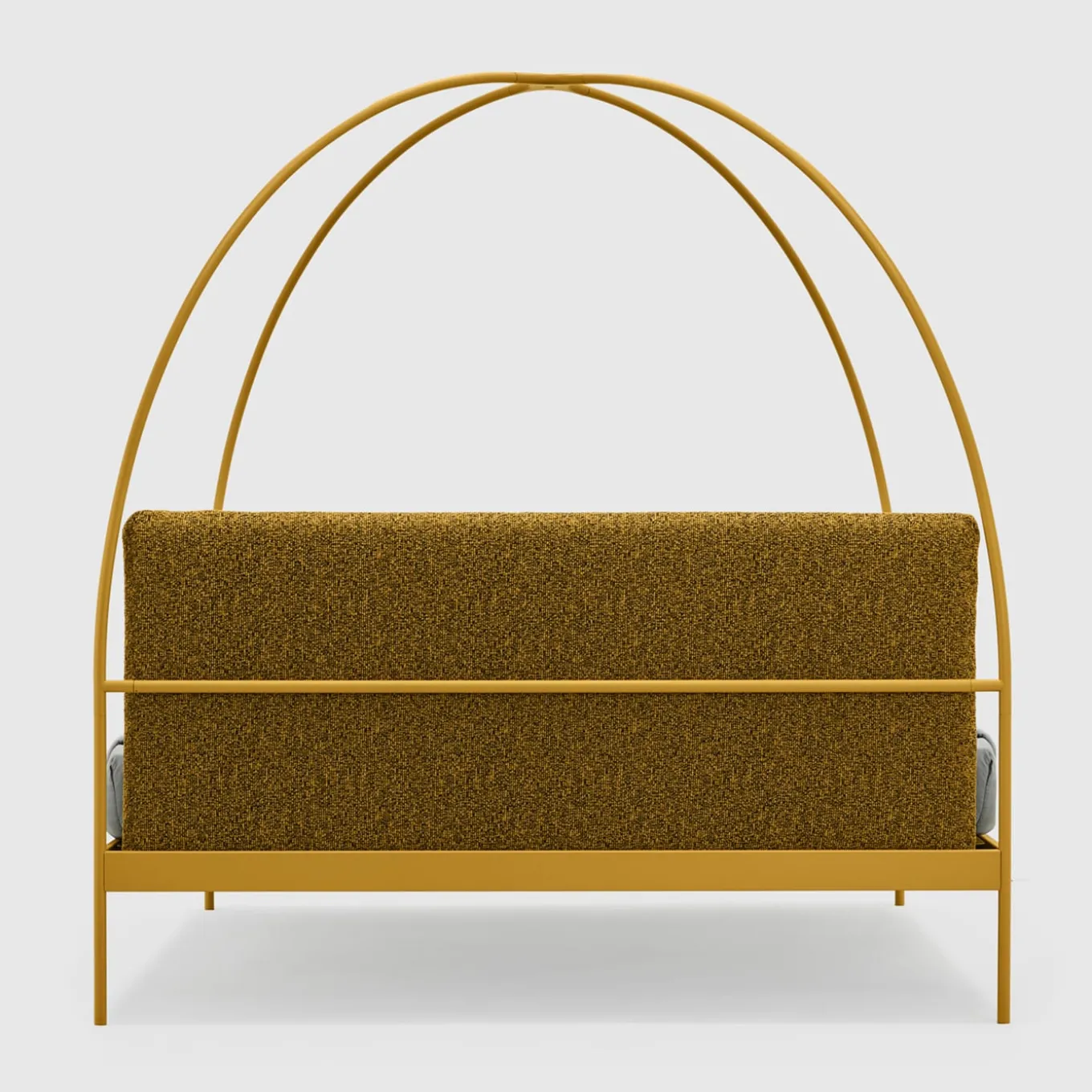Vivace e poetico al tempo stesso, questo letto matrimoniale a baldacchino attualizza elegantemente una volta a crociera con le sue curve tubolari che convergono verso l’alto. La struttura in ferro, elegante e avvolgente, proposta in una vivace laccatura gialla, è completata da una lineare testata imbottita e rivestita in tessuto color melange. Incastonata nel punto in cui gli elementi tubolari si incrociano, una sorgente a LED permette di rilassarsi durante le sessioni di lettura. Grazie ai pulsanti sulle gambe posteriori, la luce può essere attenuata a piacere. Il LED non è incluso.