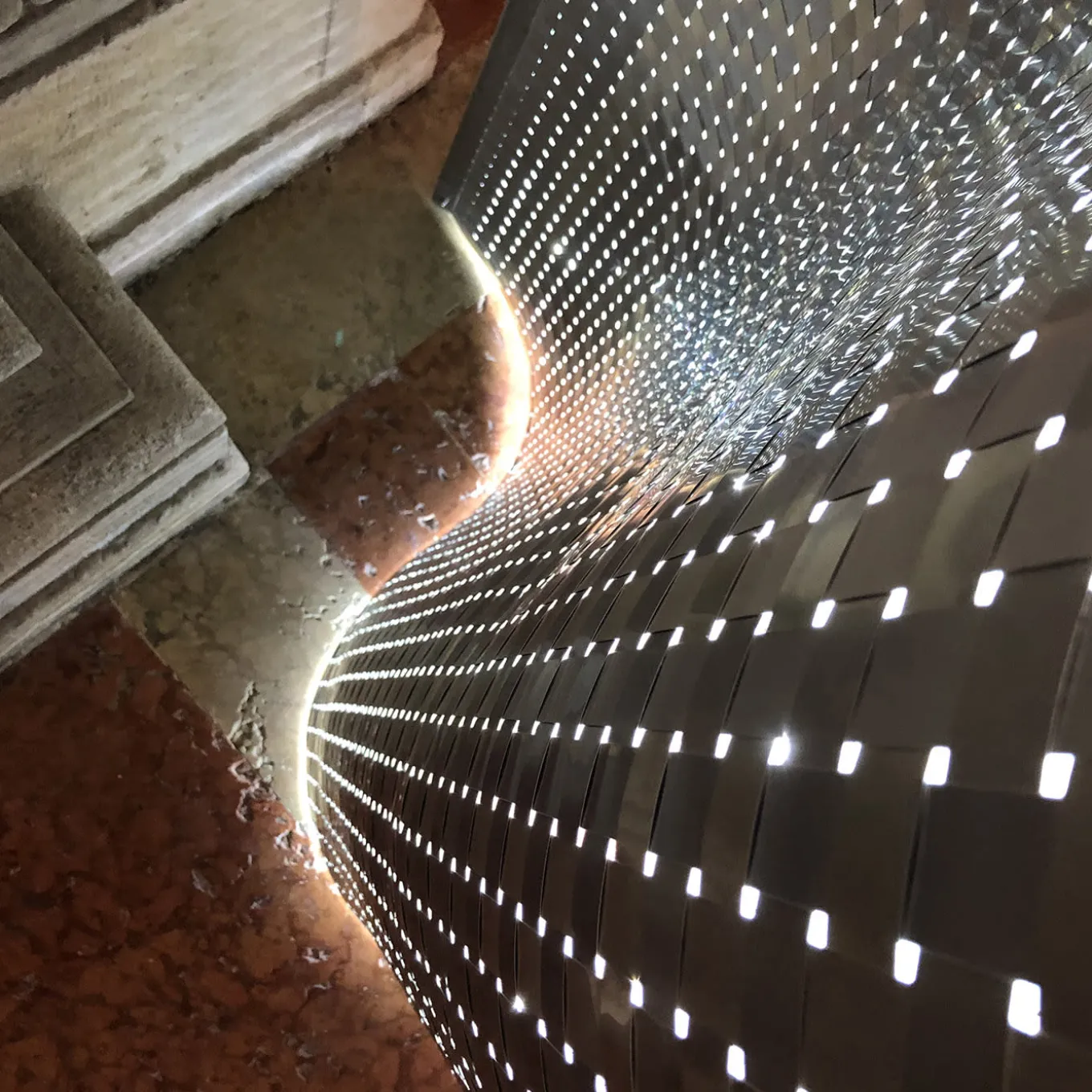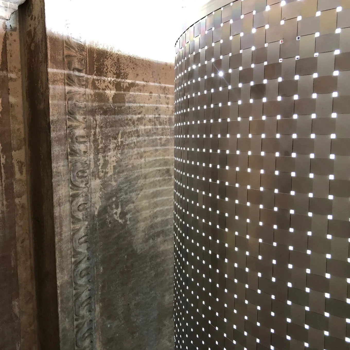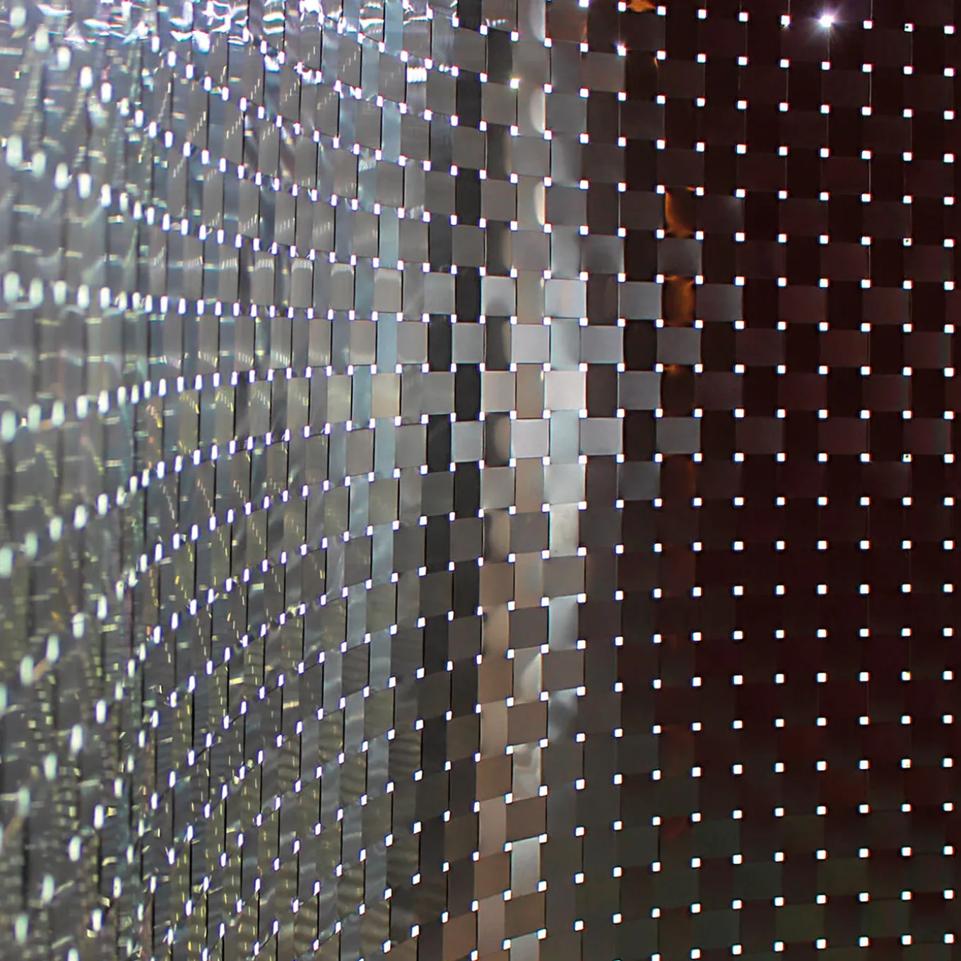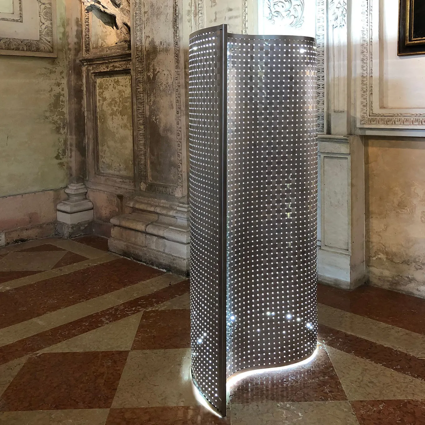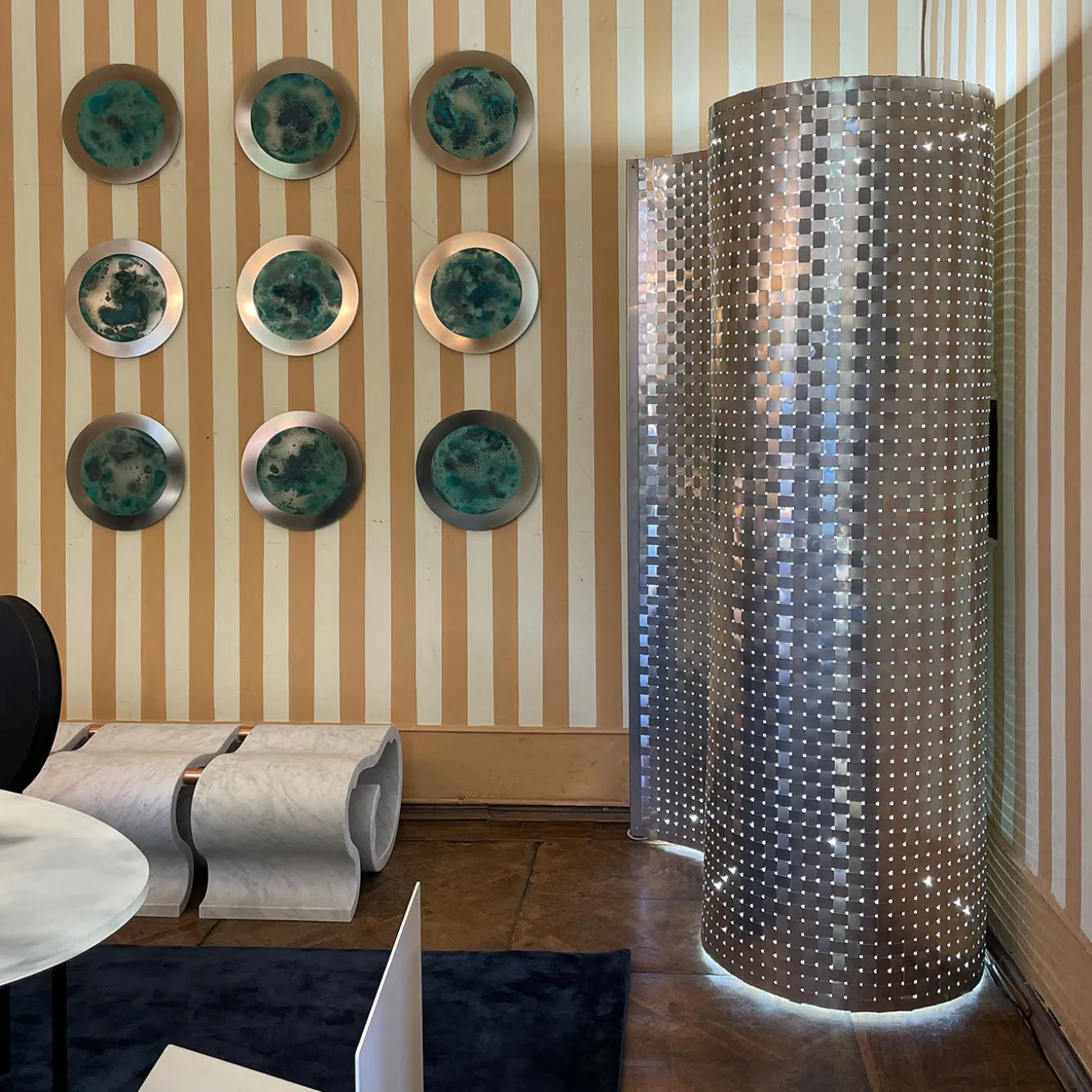 Yar Modulo B, creato dallo studio di design Inthegarden, è un grande modulo di illuminazione con una struttura in acciaio rivestita di Splot, una trama di alluminio realizzata a mano. Progettato come elemento di illuminazione singolo o per essere utilizzato insieme ad altri moduli, Yar è montato su ruote per facilitare gli spostamenti. Parte della collezione Babylon, questo pezzo aggiunge uno stile dinamico a qualsiasi ambiente.