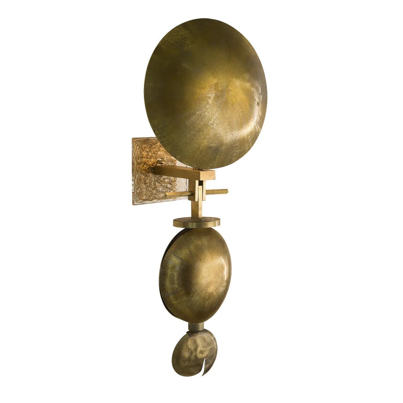 Questa applique completerà al meglio un ambiente contemporaneo con la sua imponente struttura composta da tre dischi di ottone naturale disposti in una configurazione lineare dal più grande al più piccolo. La texture simile a un tessuto conferita ai dischi di ottone è stata realizzata interamente a mano. Un elemento in cristallo sfaccettato a mano, di forma quadrata, lo fissa alla parete. Su richiesta, sono disponibili certificazioni per il settore contract e commerciale.