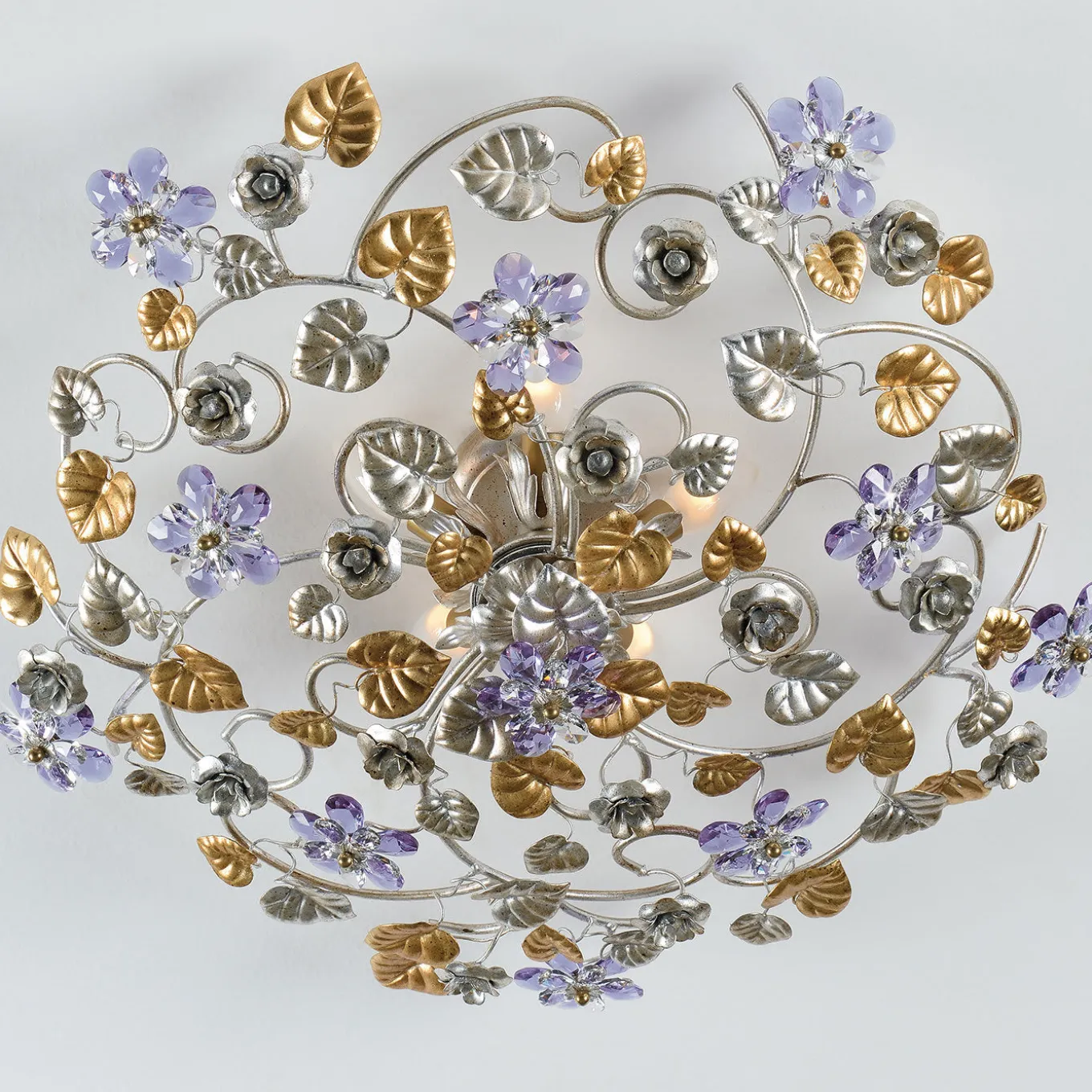 Deliziosamente elaborata e decorata, questa splendida lampada da soffitto a 5 luci è realizzata in metallo e decorata con splendidi dettagli in argento antico e foglia d’oro. Gli squisiti fiori in cristallo bicolore lilla sono gli elementi perfetti per completare la preziosa lavorazione del metallo e aggiungono un tocco di finezza a questo elegante accessorio.