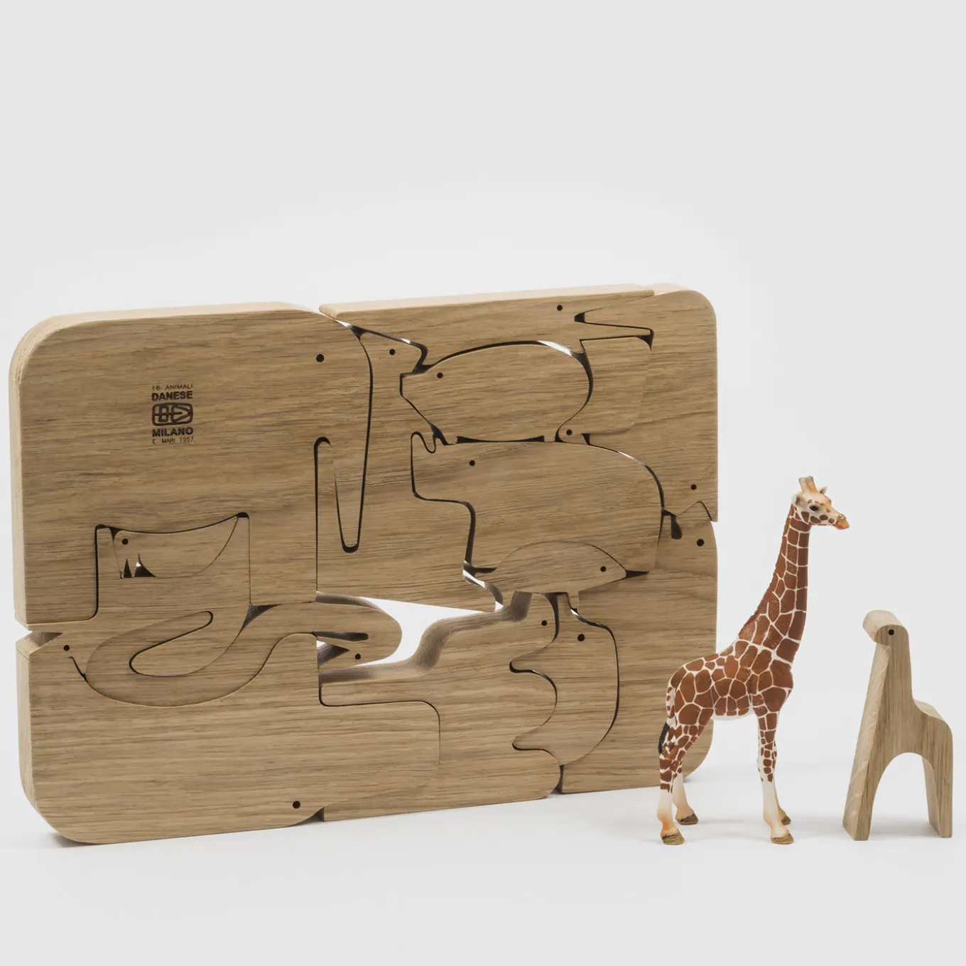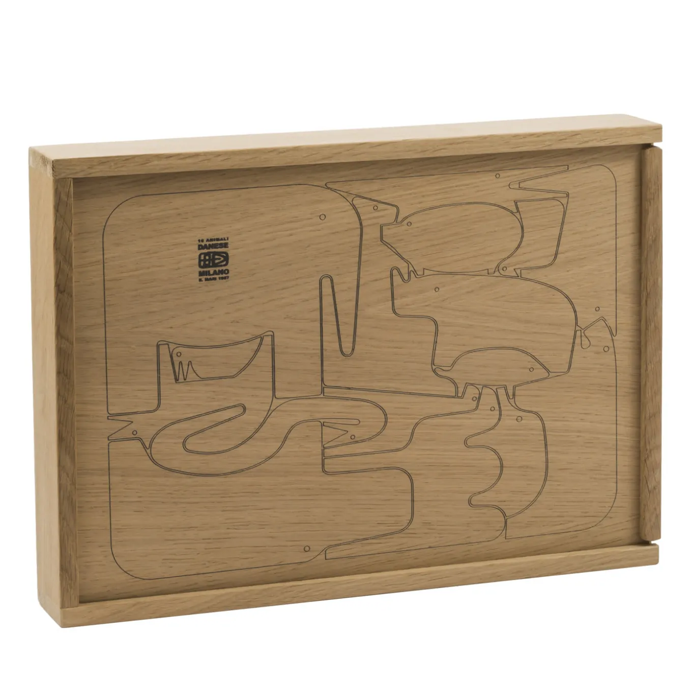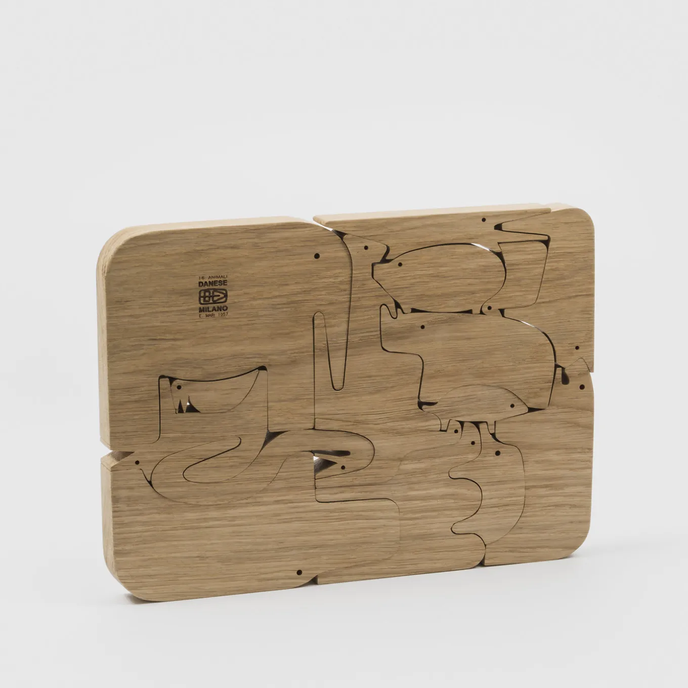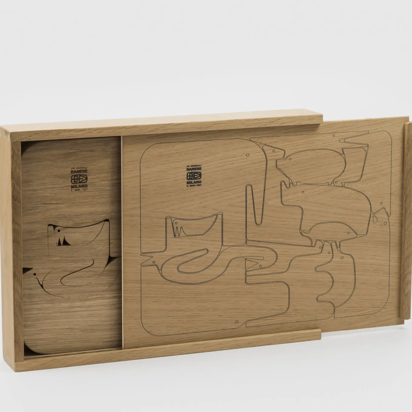 Questo intrigante puzzle di Enzo Mari è uno dei più apprezzati esempi di design sviluppati nel campo dei giochi per bambini. L’elegante struttura multipla sfrutta un sistema a incastro che consente di modellare i profili di 16 animali da un’unica tavola di legno, operando un solo taglio ininterrotto.