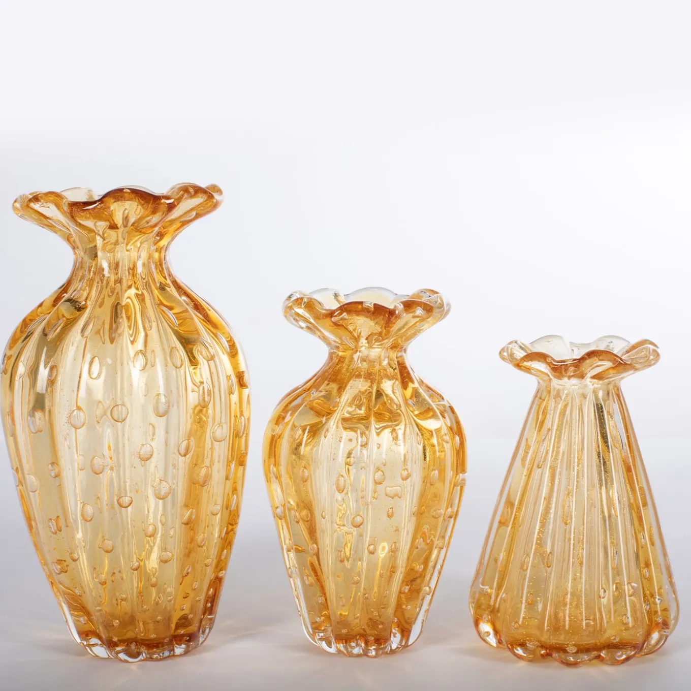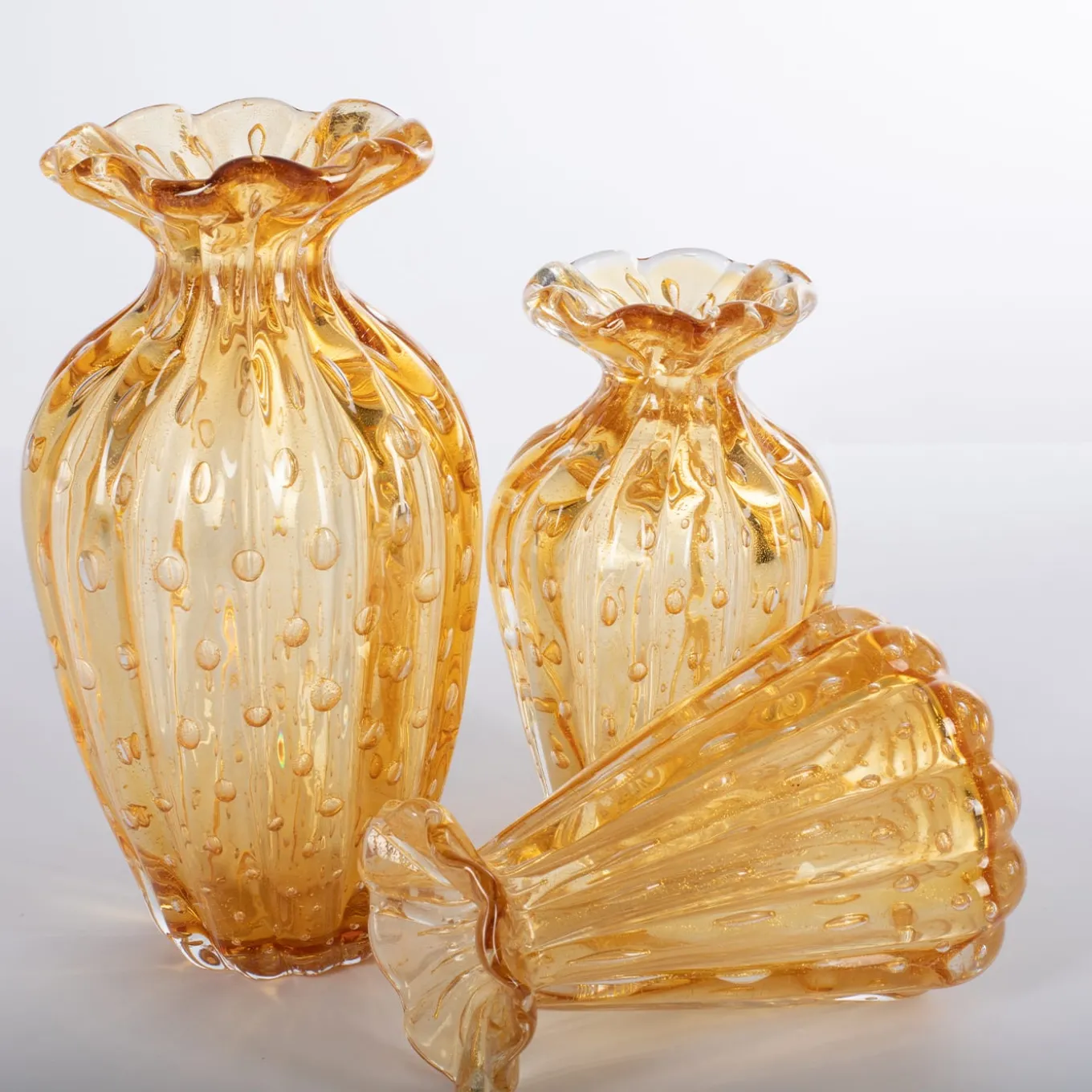 Questo splendido set di tre vasi di colore ambrato è caratterizzato dall’eleganza senza tempo di un design unico, soffiato a bocca a Murano da maestri artigiani secondo le tecniche tradizionali. I vasi presentano un design a balze con un bordo ondulato, bolle d’aria intrappolate all’interno e puntini d’oro che conferiscono loro una sorprendente qualità scintillante. Dal più grande al più piccolo, i pezzi misurano cm 10x19H, 9x15H e 12x10H.