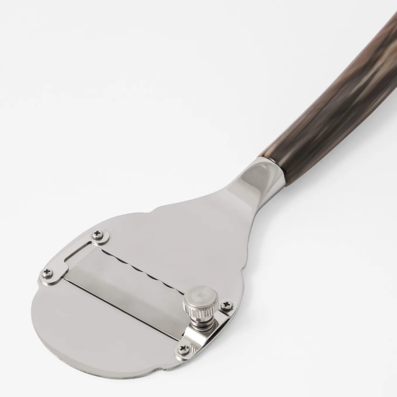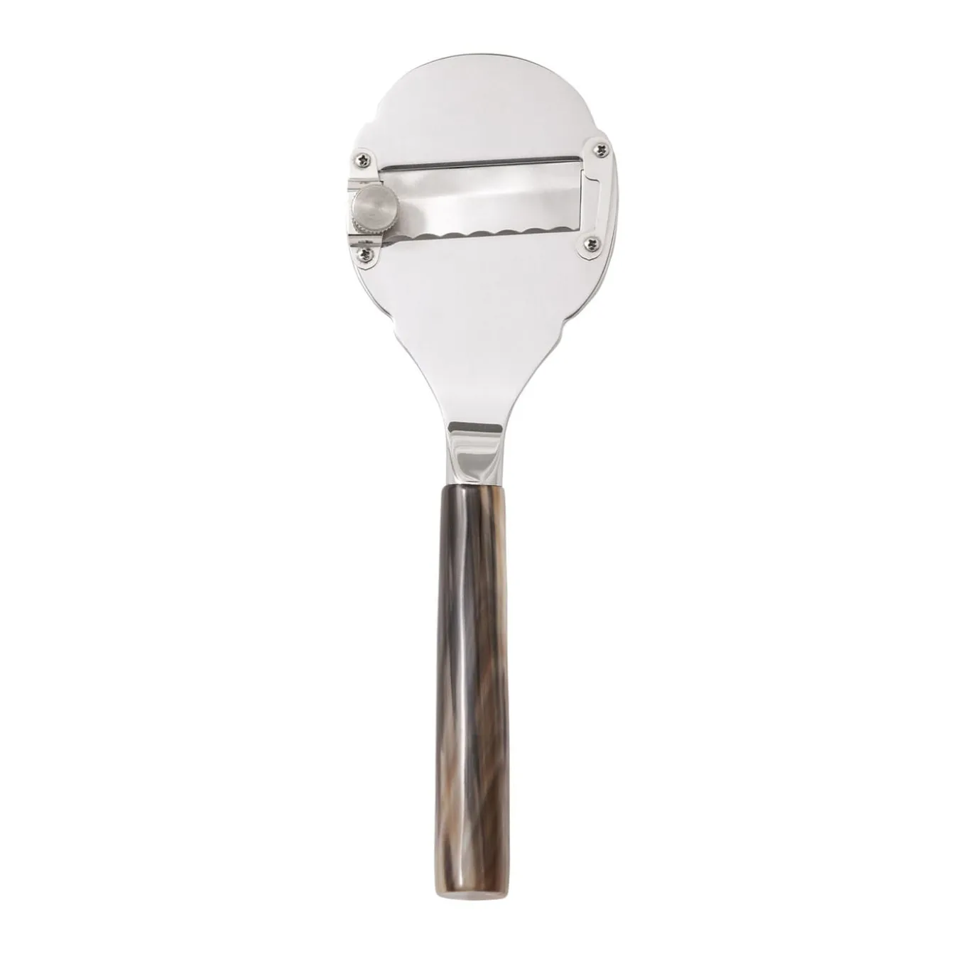 Questo affetta tartufi con manico in corno è perfetto per le occasioni speciali e i banchetti in compagnia di grandi vini. Sapientemente realizzato a mano in acciaio inossidabile 18/10 e corno naturale biondo venato, il design elegante mette in risalto le belle qualità distintive del corno, dalle sue sfumature alla sua dolce curva, fino al preciso meccanismo di affettatura. Consegnato in una scatola fatta a mano con interno imbottito e foderato di raso, perfetto per essere conservato. Fa parte della collezione Classic.