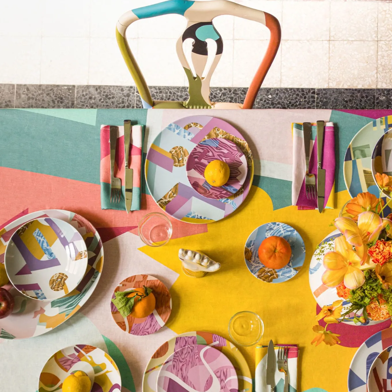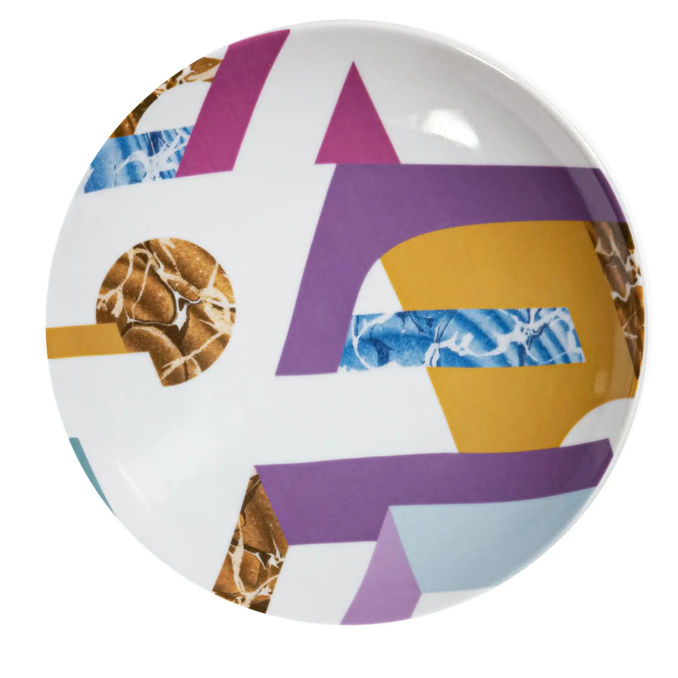 Vito Nesta e Alessandro Guerriero hanno unito le loro forze per creare la collezione Alchimie per il brand Grand Tour. Diversi prodotti, dalle porcellane ai tessuti, vengono così resi immortali nel tempo dal tocco di uno dei maestri del design italiano, fondatore dello studio Alchimia del 1976. Colori vibranti, contrasti forti, forme geometriche e astratte, di goni tipo, si incastonano e dialogano fra di loro, creando dei piccoli universi di pura bellezza visiva. Il tocco finale apportato all’interno di queste grafiche è l’uso di diverse texture che si uniscono al disegno a tinte piatte, rendendolo ancora più accattivante e divertente. Questo piatto fondo da 21cm è uno dei sei che compongono la collezione.