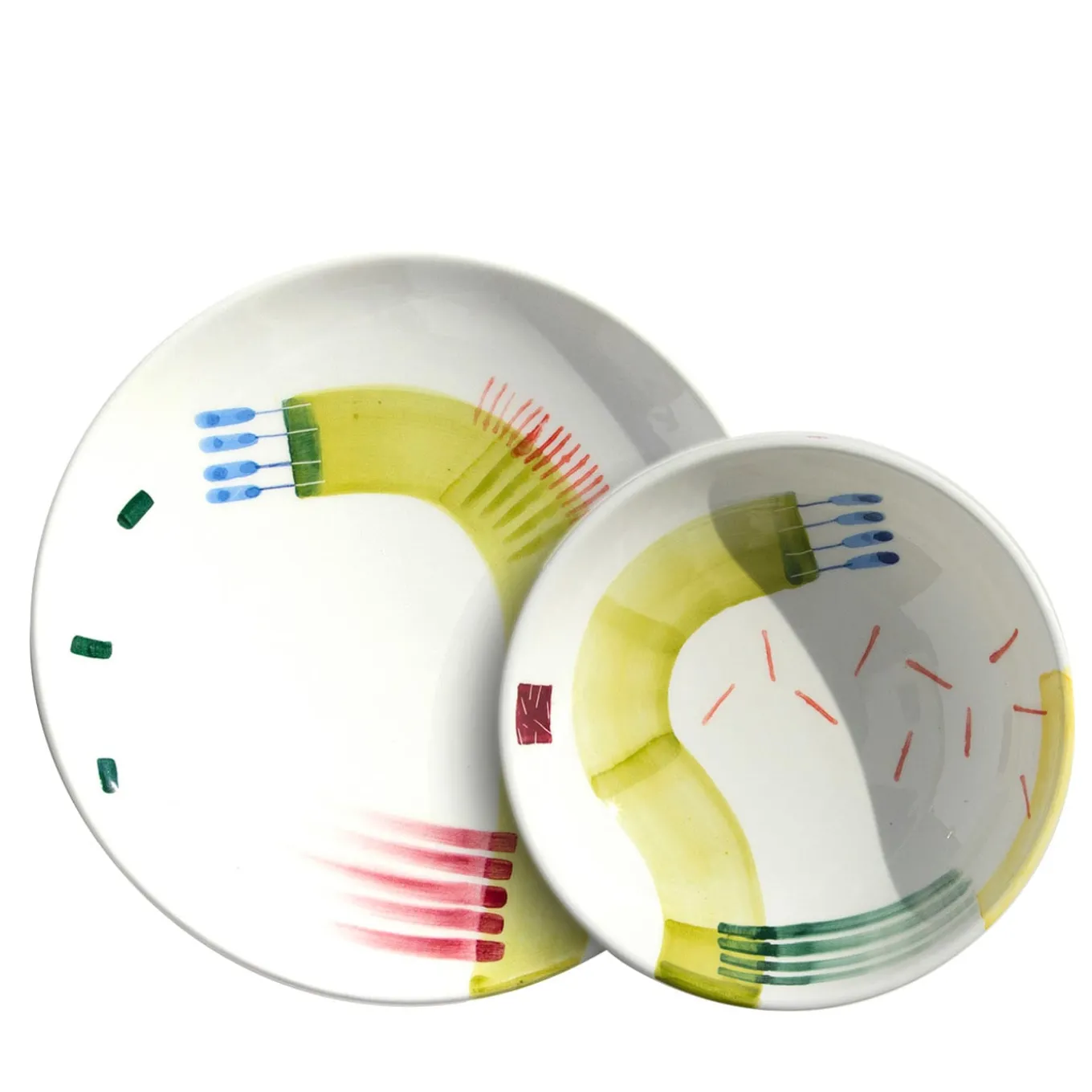 Questo set di due piatti da portata e da zuppa è uno dei modelli della collezione Divertissement. La striscia verde che attraversa il piatto insieme ad alcuni piccoli dettagli colorati ricorda le piume colorate dei pappagalli caraibici. Ogni pezzo è unico e dipinto interamente a mano, il disegno può variare leggermente. Per ulteriori informazioni e opzioni, contattare il Concierge.