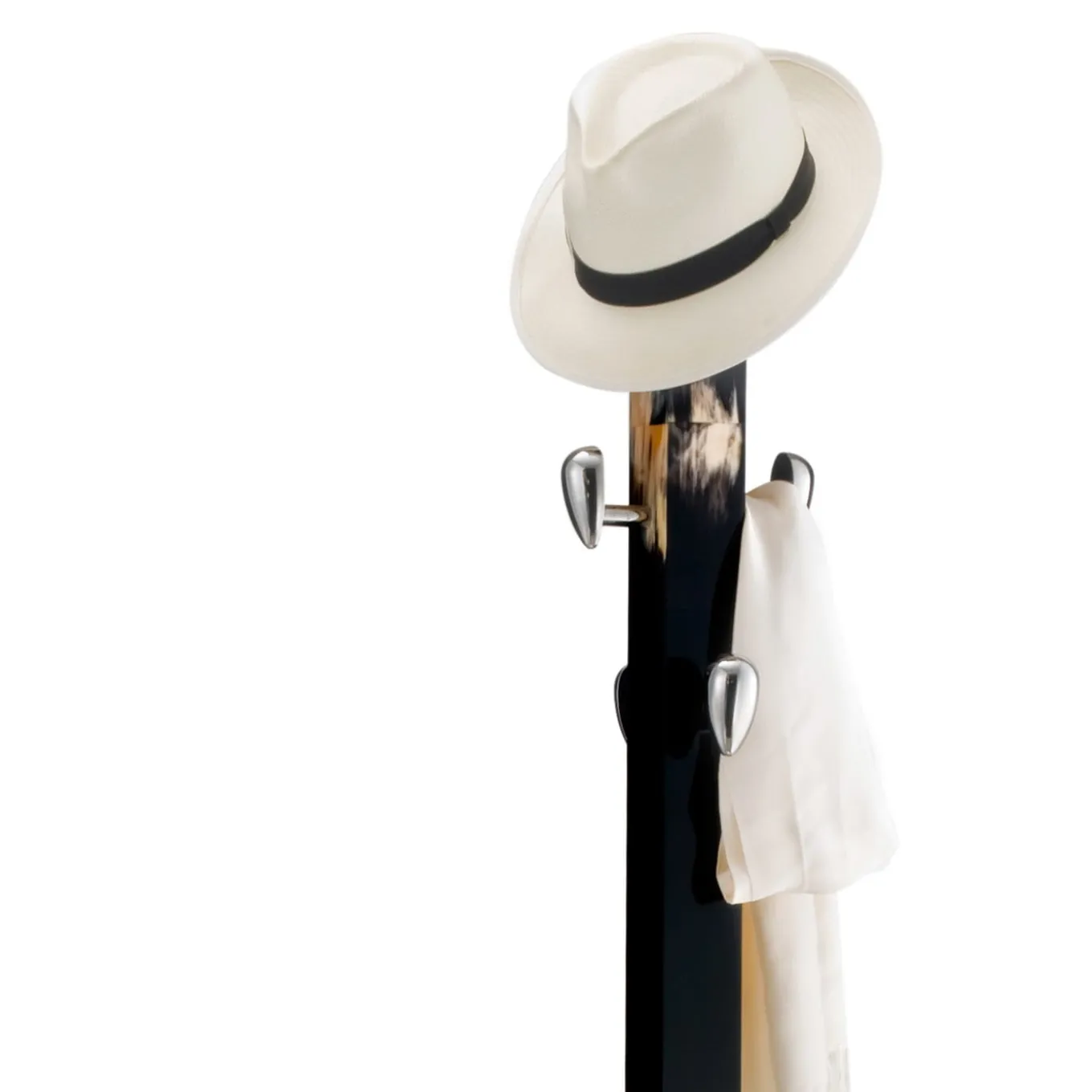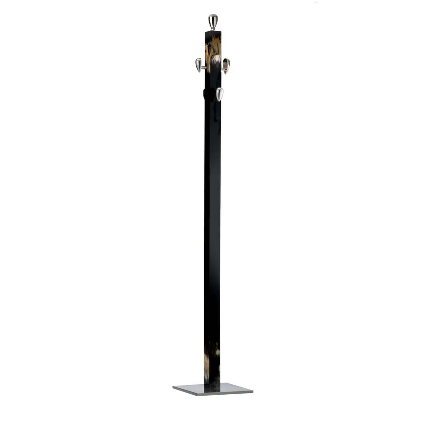 Questo pezzo esclusivo ed elegante combina materiali e design di lusso con una silhouette pulita e contemporanea. La struttura alta in legno nero laccato, che si erge da una base quadrata in ottone cromato, è arricchita nella parte superiore e inferiore da dettagli in corno scuro con squisite sfumature frutto di una tecnica di lavorazione esclusiva. Cinque pomelli a forma di uovo in ottone cromato offrono un posto elegante e comodo per appendere cappotti, cappelli e accessori. La qualità scultorea di questo appendiabiti lo renderà un raffinato e moderno accento decorativo anche quando è vuoto.