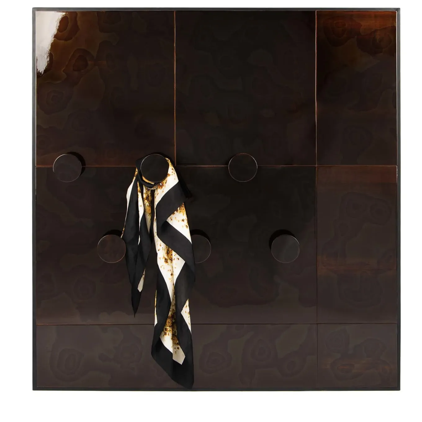 Questo sorprendente appendiabiti fa parte della collezione Sorry Jannis, ispirata a Jannis Kounellis, uno dei più apprezzati interpreti dell’Arte Povera. Grazie a questi suggestivi pannelli, un appendiabiti diventa un quadro. Interamente lavorati a mano, questi pannelli sono realizzati con un materiale sviluppato da Frisoli, il Frisoli Gea, un materiale aerospaziale particolarmente raro che assomiglia al legno. Vanta sfumature viola intenso con striature color rame uniche nel loro genere che rendono ogni pezzo unico e non riproducibile.