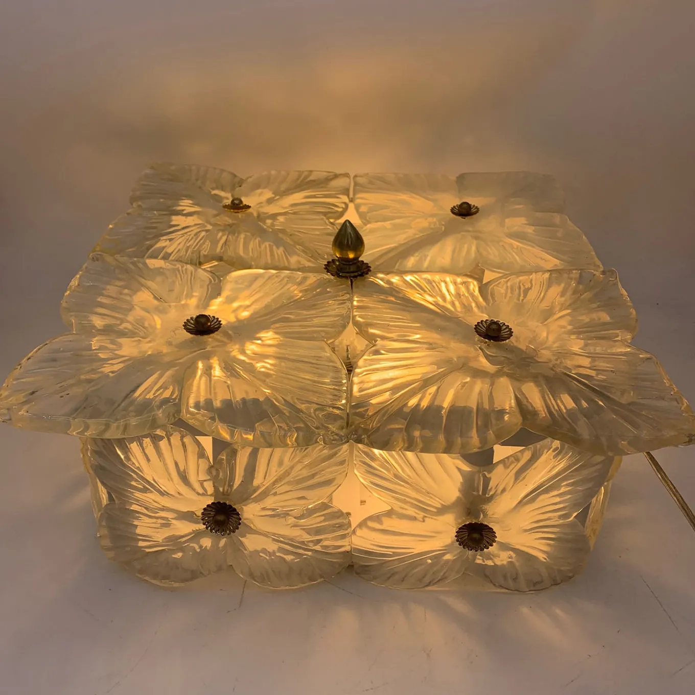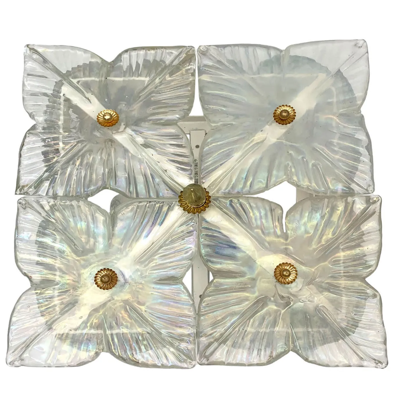 Questa squisita lampada da parete a forma di fiore di Murano presenta una straordinaria fusione di arte e illuminazione. Realizzata in vetro raro, la lampada presenta un accattivante disegno floreale che valorizza qualsiasi spazio. I petali in vetro trasparente e acidato emanano eleganza, rendendola non solo un apparecchio di illuminazione ma un potenziale pezzo da museo. Progettato per essere versatile, questo apparecchio può essere installato sia a soffitto che a parete, per adattarsi a diverse estetiche d’interni. È dotato di tre attacchi per lampadine E27, ideali per l’illuminazione a LED, che garantiscono funzionalità ed efficienza energetica. Gli originali accenti in ottone aggiungono un tocco di calore, armonizzandosi perfettamente con gli elementi in vetro.
