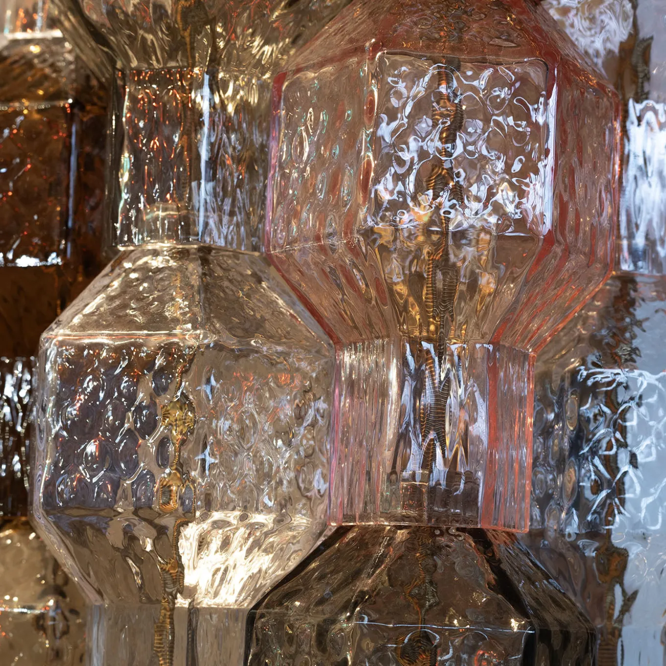 Questa applique verticale presenta un’armonia scultorea di grandi moduli in vetro sfaccettato, distribuiti su cinque colonne. Ogni pezzo è realizzato a mano usando uno stampo e rifinito con una texture martellata che esalta la rifrazione della luce. Disponibile in una palette mista di cristallo, rosa, ambra, grigio fumé e toni cola, gli elementi in vetro formano una reinterpretazione luminosa e contemporanea del design veneziano degli anni ’60. La struttura in metallo finita in ottone completa la texture del vetro, creando un’eleganza senza tempo adatta a una varietà di interni. Personalizzabile su richiesta in termini di colori, dimensioni e finiture. Per ulteriori informazioni, contattare il Concierge. Le lampadine non sono incluse.