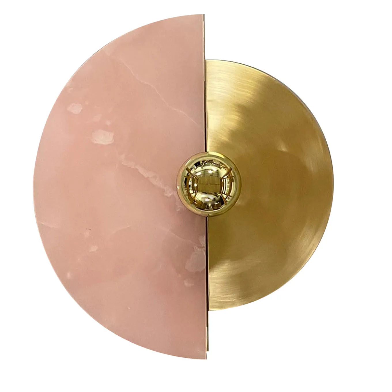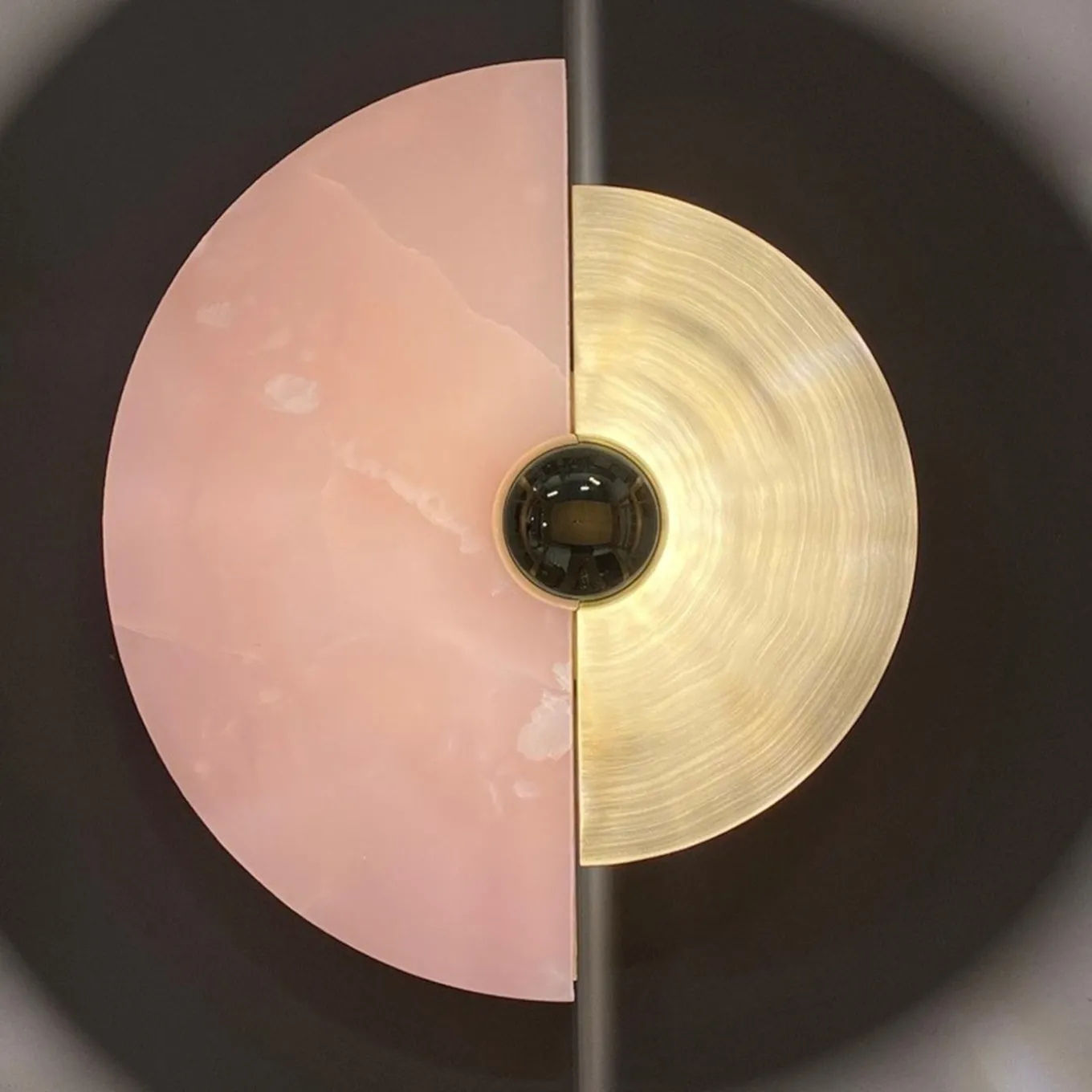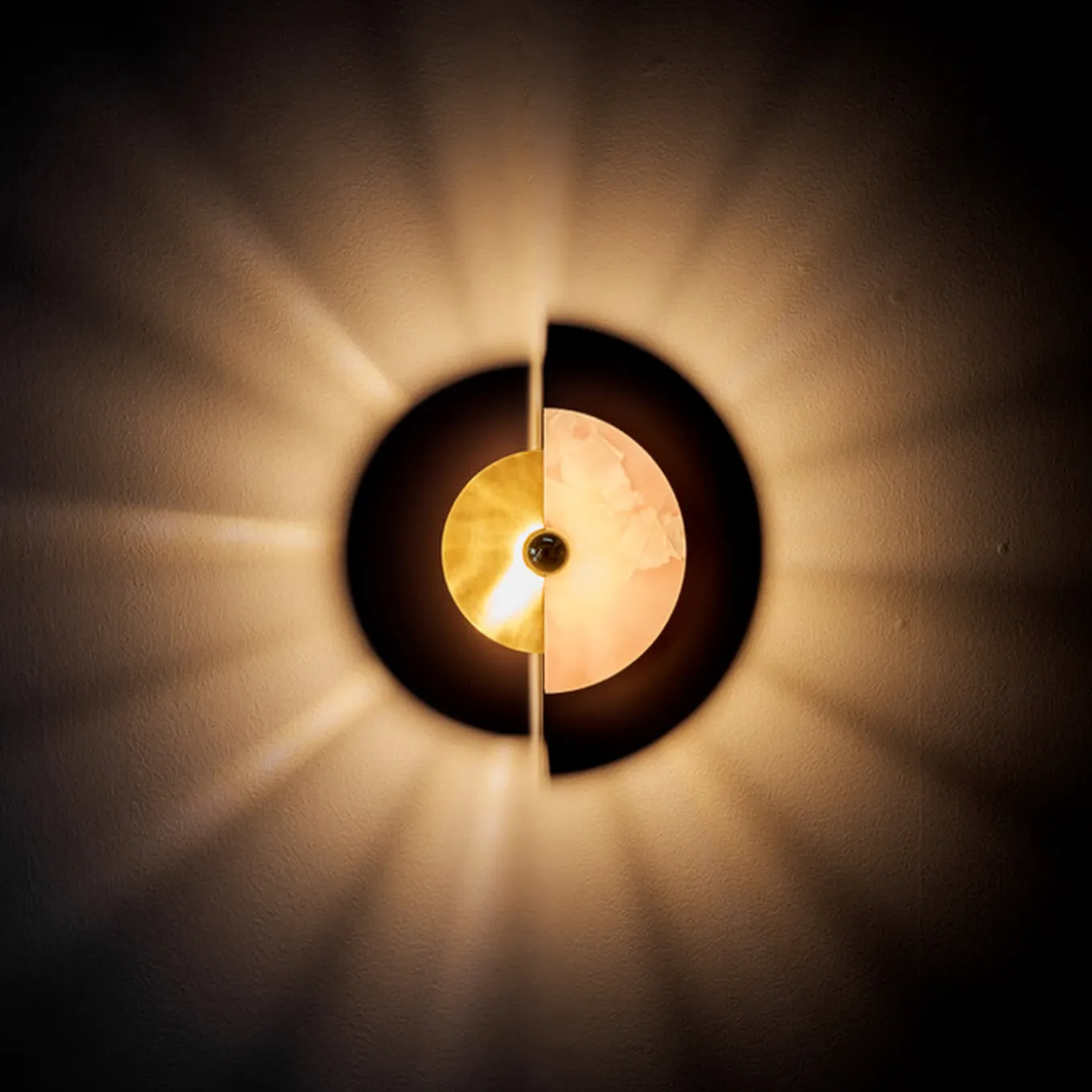 L’applique Levante, con la sua forma circolare, è un forte richiamo al sole. La possibilità di collocare i dischi in 12 posizioni diverse offre originali giochi di luci e ombre proiettati sulla parete. La struttura e il disco in ottone, abbinati all’altro disco in onice, sono illuminati da una lampadina con calotta dorata, che enfatizza i toni dei materiali e, allo stesso tempo, illumina la parete con colori caldi.