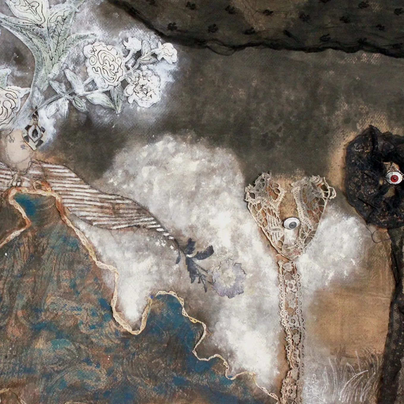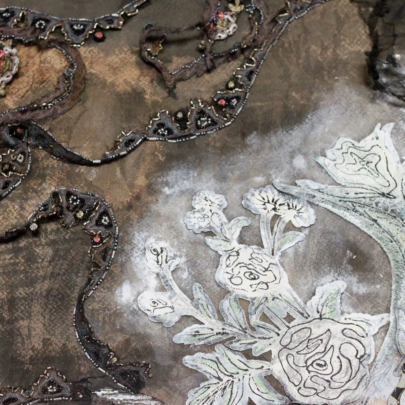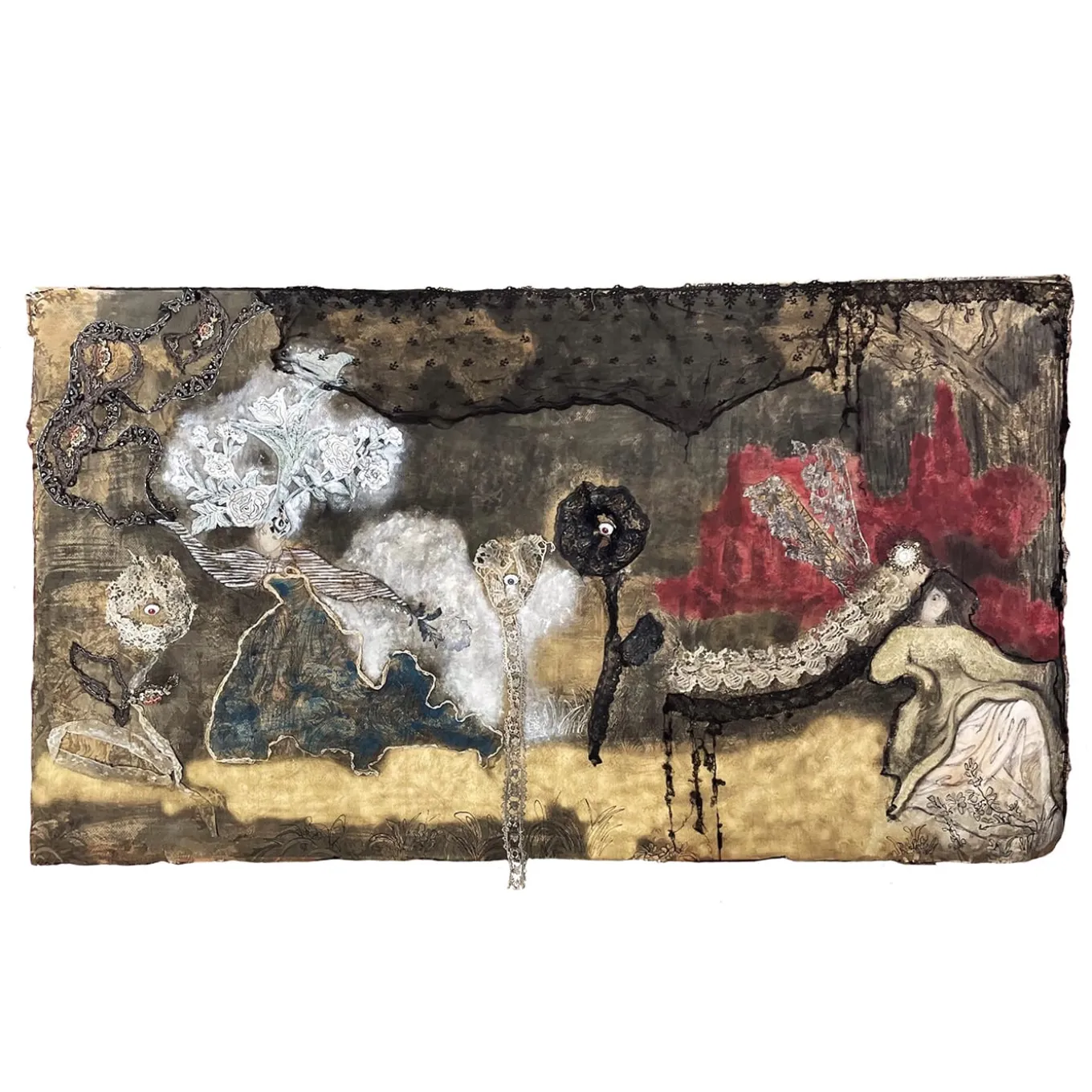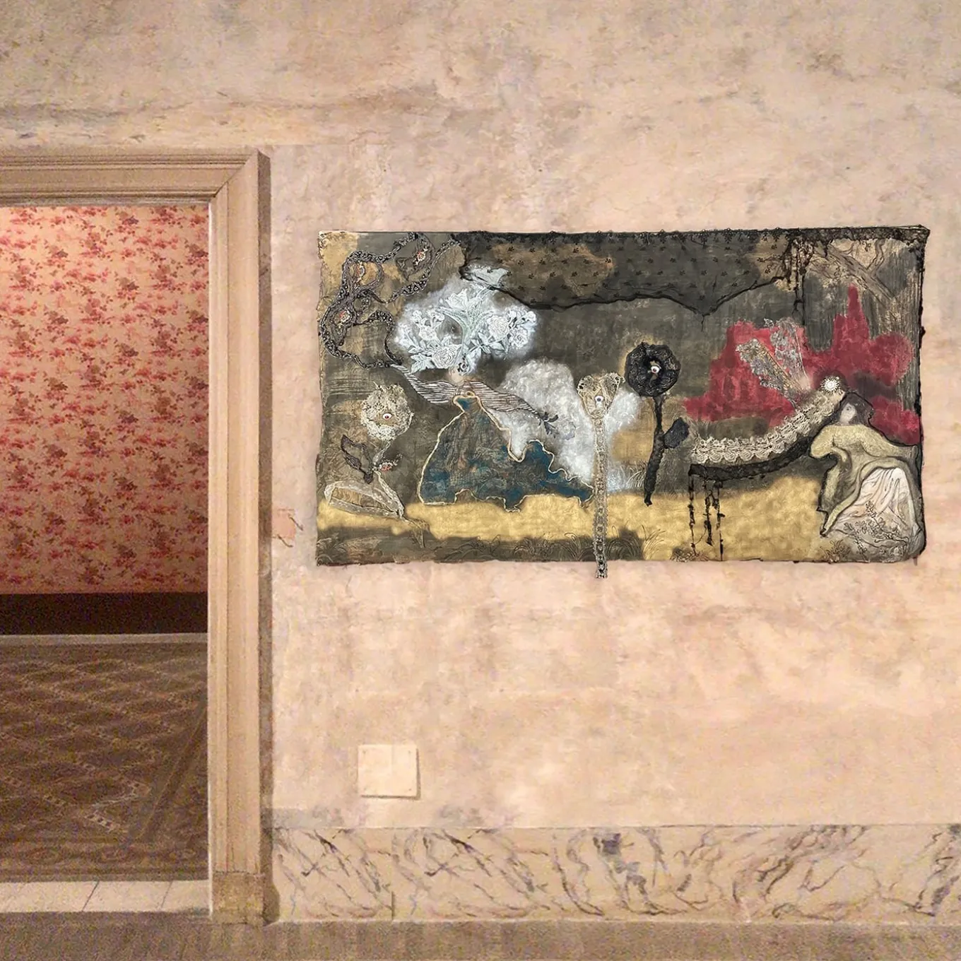 The Awaiting Tapestry reimmagina la tappezzeria antica, sovvertendo l’immaginario tradizionale della vita borghese con pittura a mano, passamanerie cucite, pizzi d’epoca, lamine metalliche, gioielli, perle e cristalli. Scene neutre e pastorali si trasformano in mondi audaci e fantastici: alberi di perle, uccelli ingioiellati, fiumi di catene e animali rivestiti di tessuto. Ogni dettaglio intricato invita a un’esplorazione più approfondita, riscrivendo la narrazione in una visione surreale e moderna. Questo pezzo è unico.