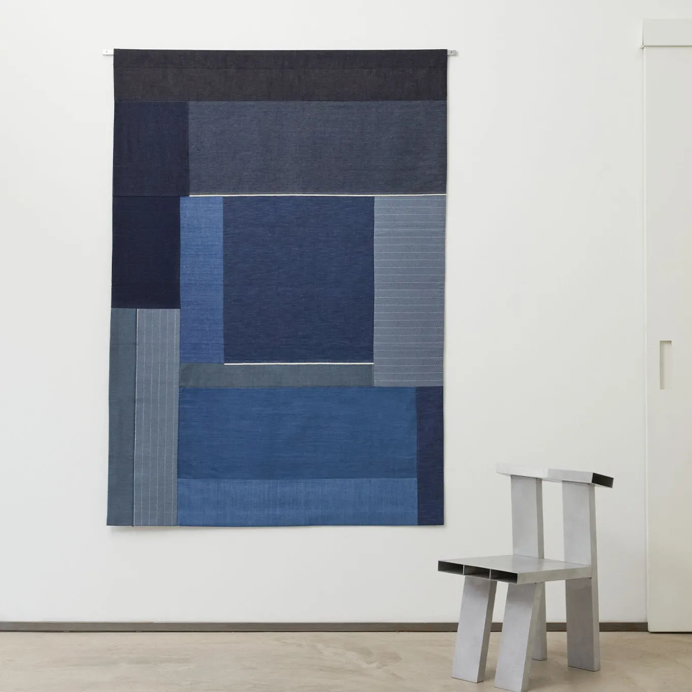 Disegnato dalla designer Giulia Fauro Alessi, l’arazzo Cowboy in denim eleva il semplice design in arte sofisticata. Ispirato alla cultura popolare del sud degli Stati Uniti, esplora il tema del rattoppo, del rammendo e della ricomposizione degli abiti da lavoro, come i blue jeans. Il denim, solitamente associato a un uso popolare e di scarso valore, viene nobilitato. L’arazzo comprende anche un’asta in alluminio satinato, n. 2 fori, 0,5 mm L148 x H2 x P1 cm, e una fodera in cotone.