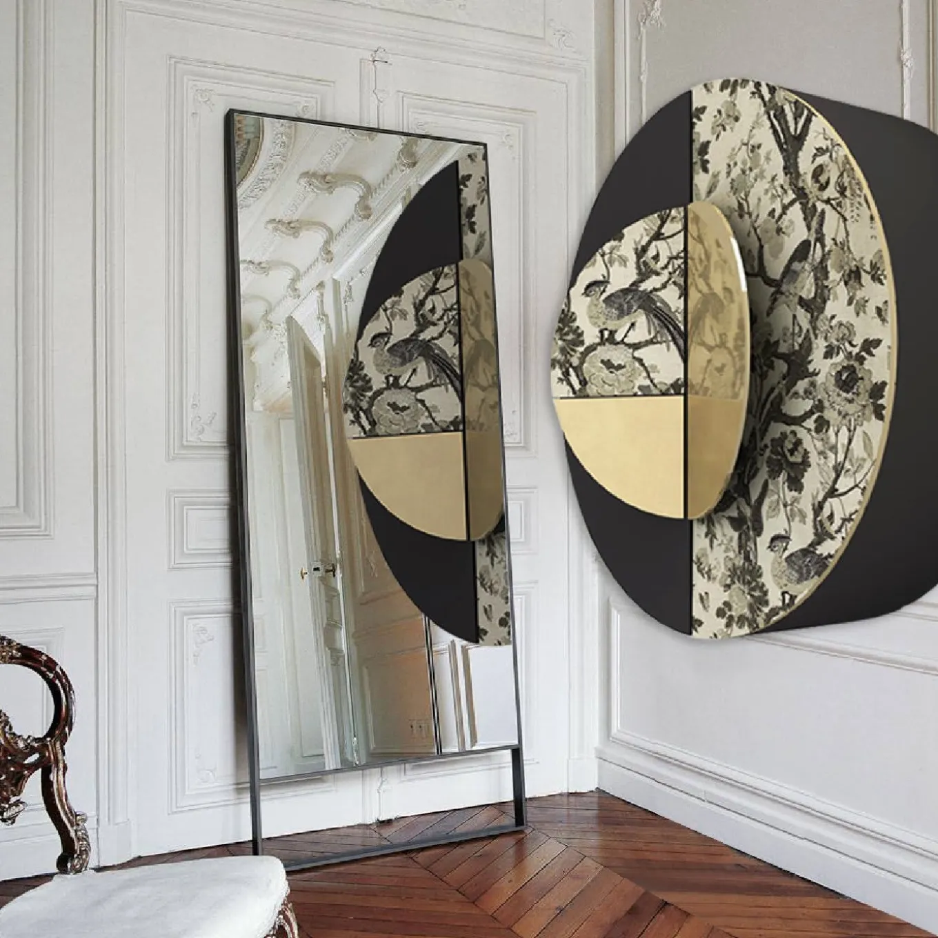 Dal design elegante e contemporaneo, questo mobile a muro vanta una silhouette rotonda realizzata con materiali raffinati. La struttura in legno nero lucido è in parte rivestita con un raffinato tessuto orientale realizzato a mano con antichi telai e presenta maniglie rotonde in ottone rifinito in oro, anch’esse in parte rivestite con lo stesso tessuto. L’interno in legno è arricchito da ripiani in vetro fumé e da uno specchio sul fondo.