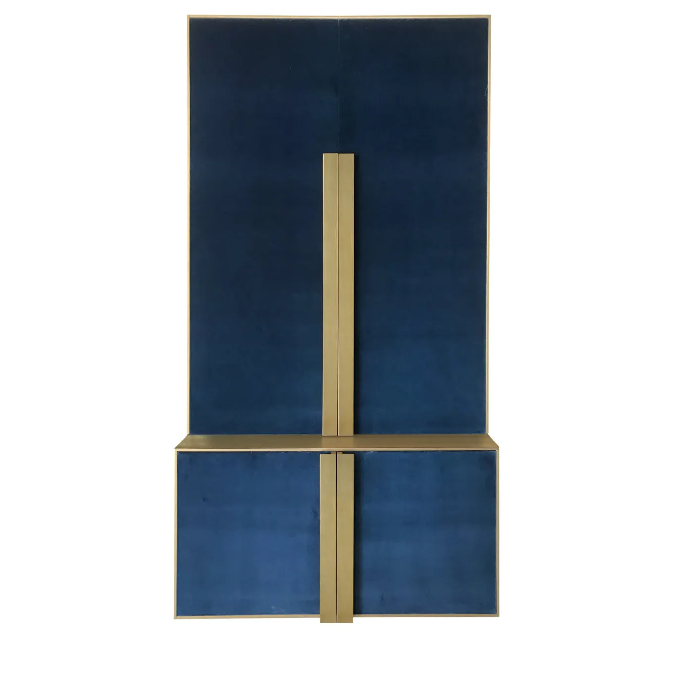 Questo superbo mobile si inserisce in qualsiasi arredamento ed è stato progettato per contenere bottiglie, bicchieri, piatti e biancheria da tavola. Realizzato da esperti artigiani, questo pezzo presenta una struttura in legno con bordi in ottone spazzolato con finitura dorata, utilizzata anche per le suggestive maniglie allungate. Il frontale e i pannelli laterali sono rivestiti in un prezioso tessuto di velluto in un elegante colore blu indaco. All’interno, il legno ha una finitura lucida dello stesso colore, che evoca lo stile art déco. Il piano presenta due cassetti in legno e due ripiani in vetro extrachiaro. Uno specchio posteriore esalta lo splendore degli interni.