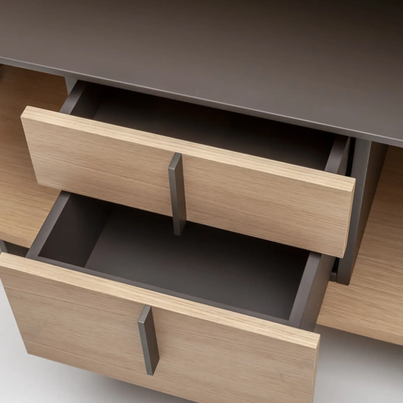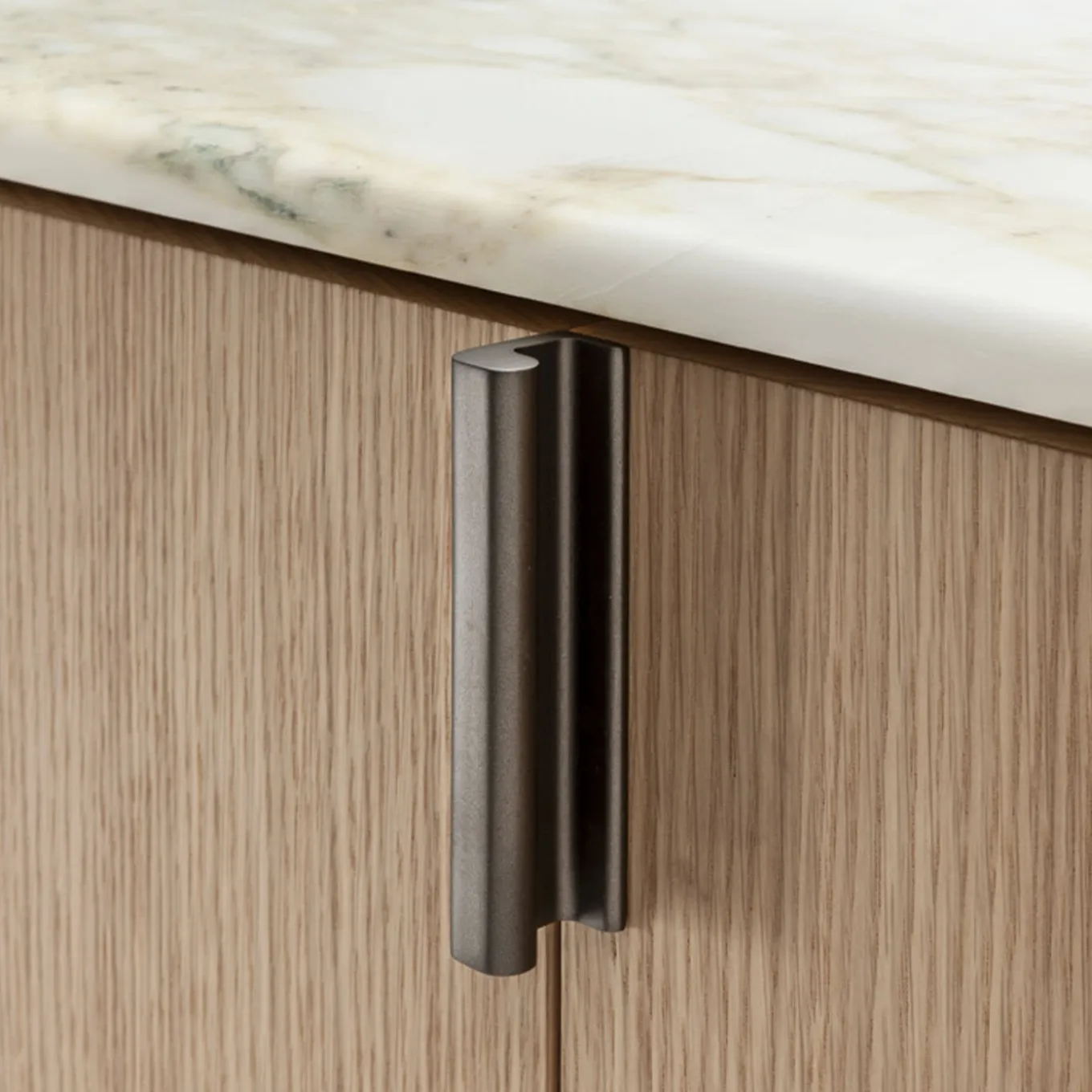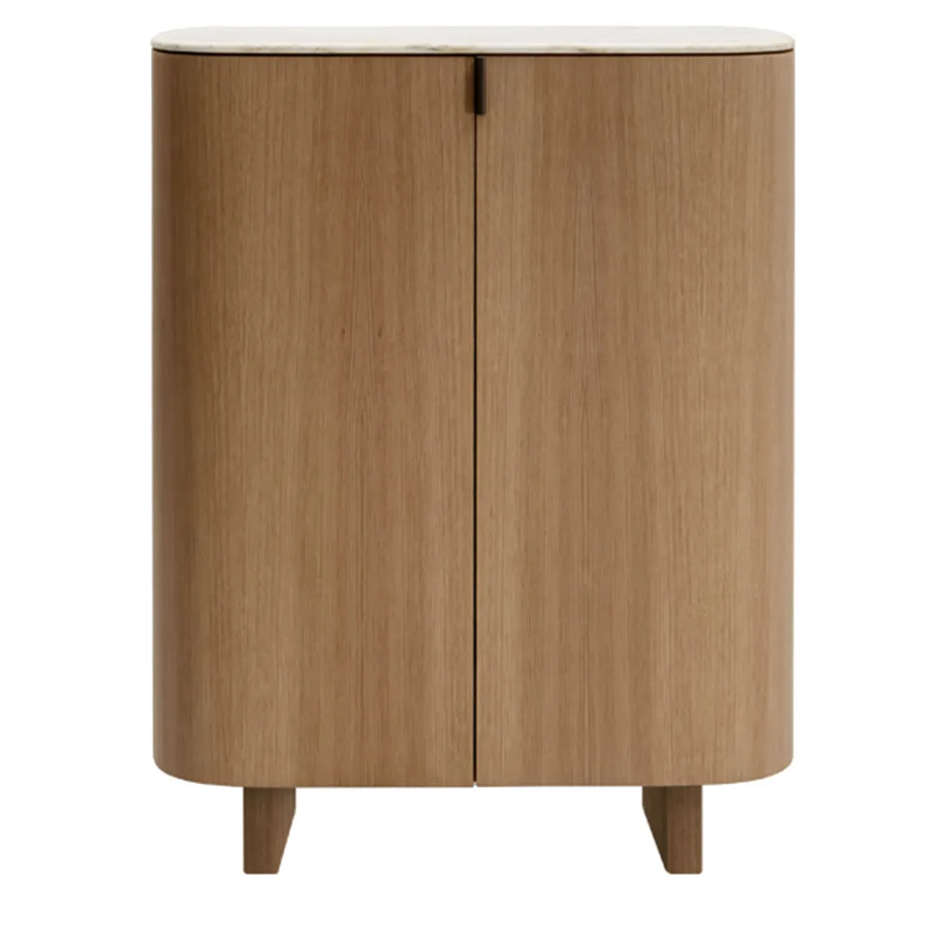 Il mobile Folio fa parte di una famiglia di credenze e armadi dalle linee curve. Realizzato a mano da maestri artigiani e rivestito in pregiata impiallacciatura di rovere naturale e marmo Calacatta.