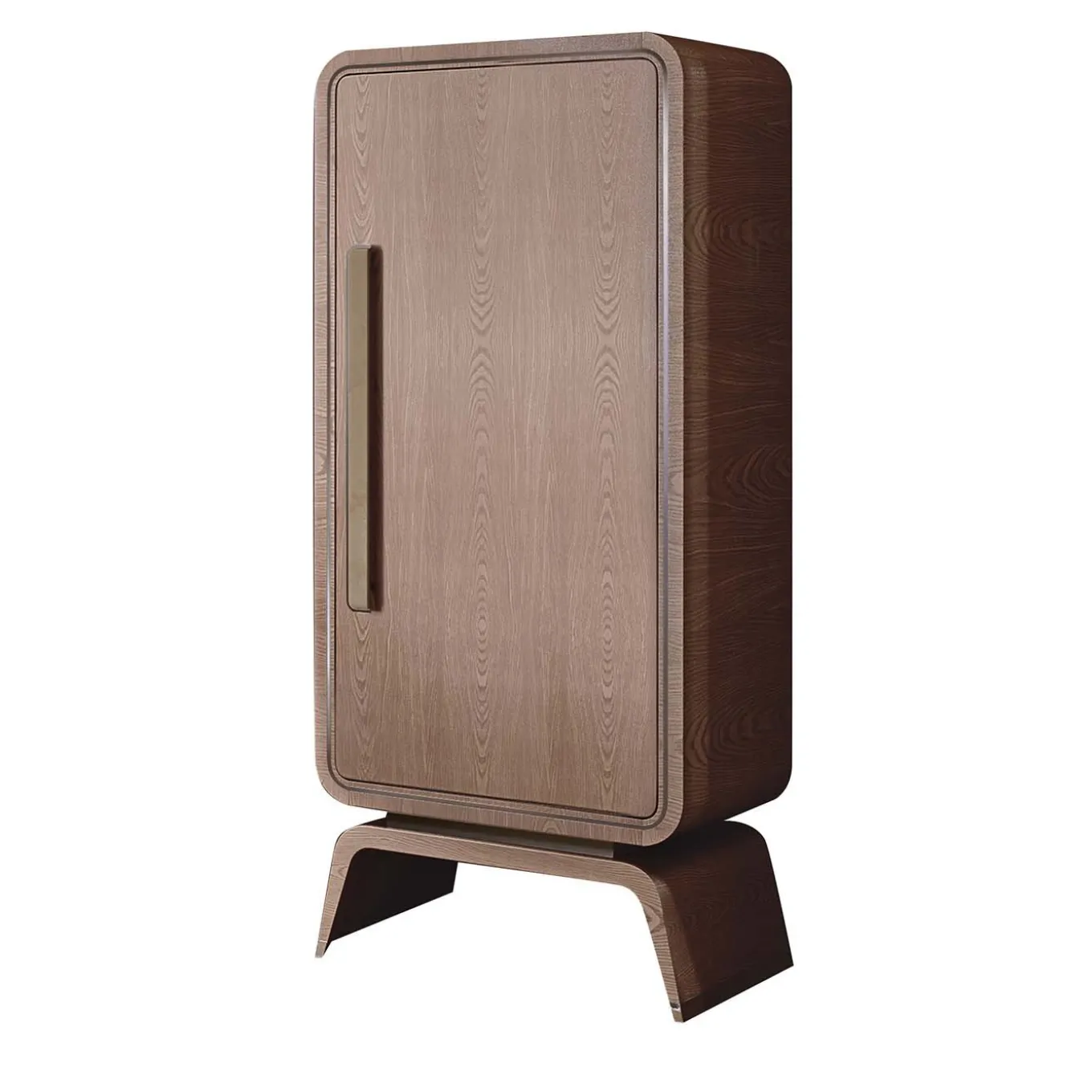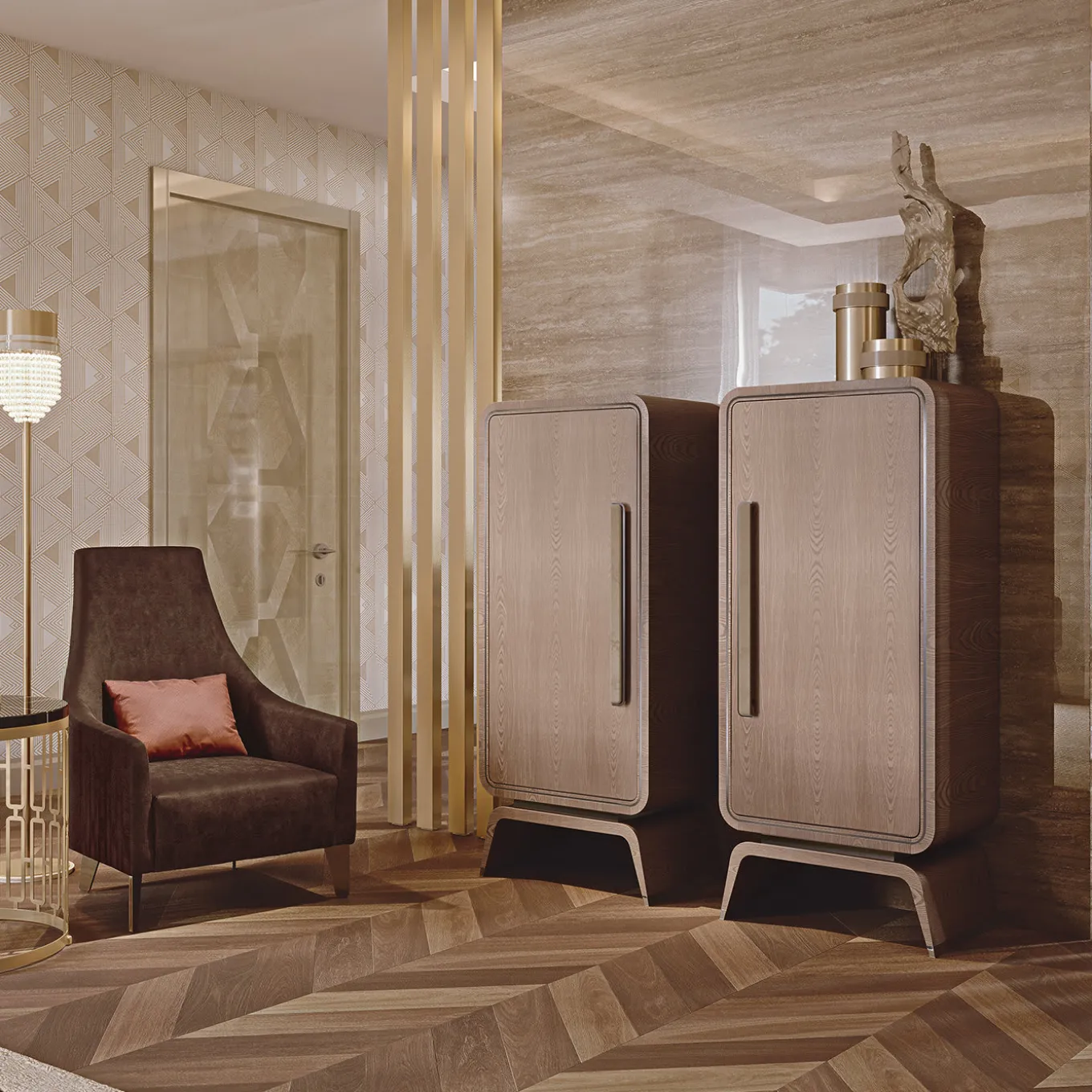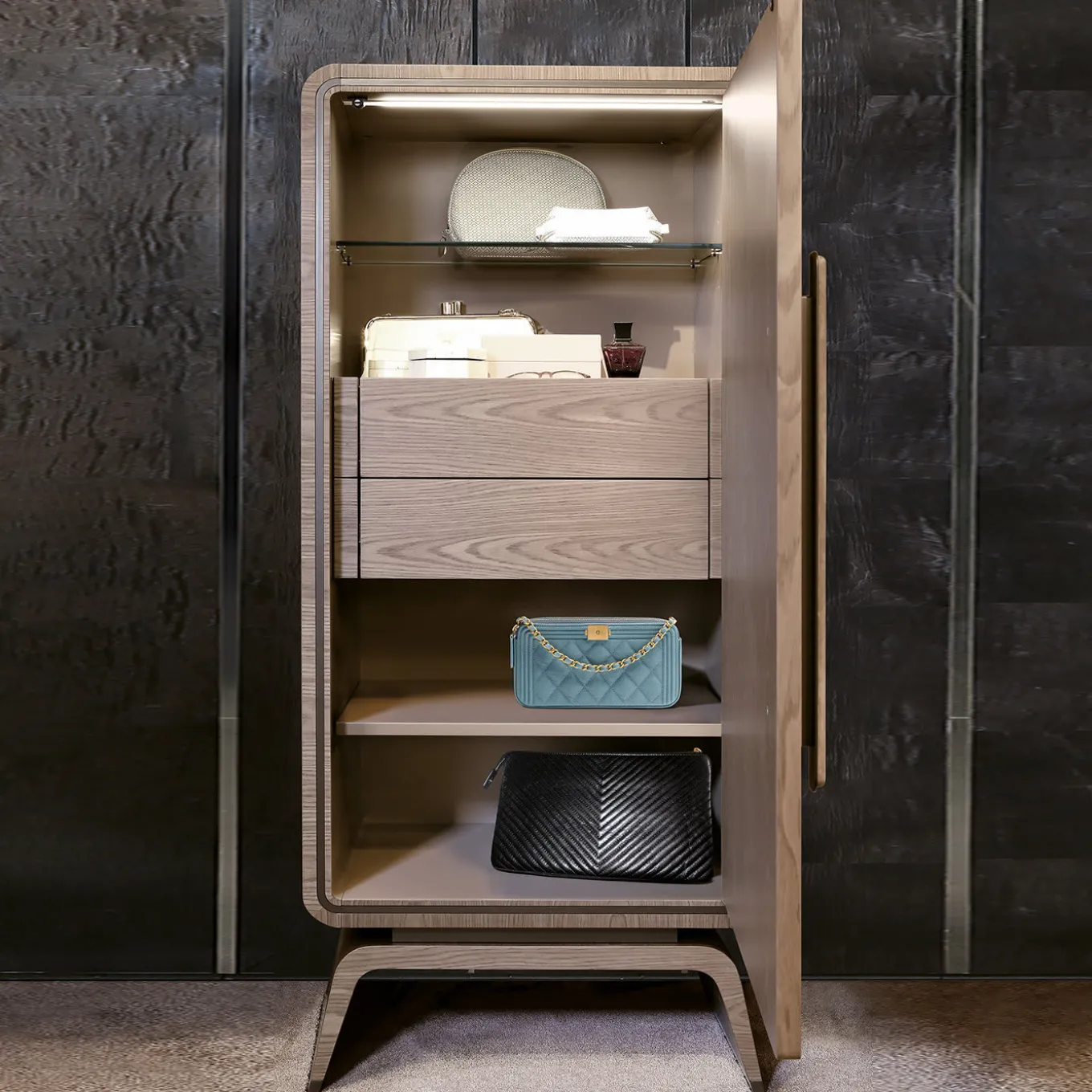 Personalizzate una camera da letto contemporanea con l’armadio Hanami Natural Mood, completamente personalizzabile. Realizzato in legno, l’armadio è disponibile in un’ampia varietà di impiallacciature, qui in Poliestere Olmo con finitura opaca. Con dettagli in metallo per sottolineare la forma, l’armadio è dotato di due cassetti interni con chiusura ammortizzata e divisori in finto nabuk. Anta destra e sinistra disponibili.