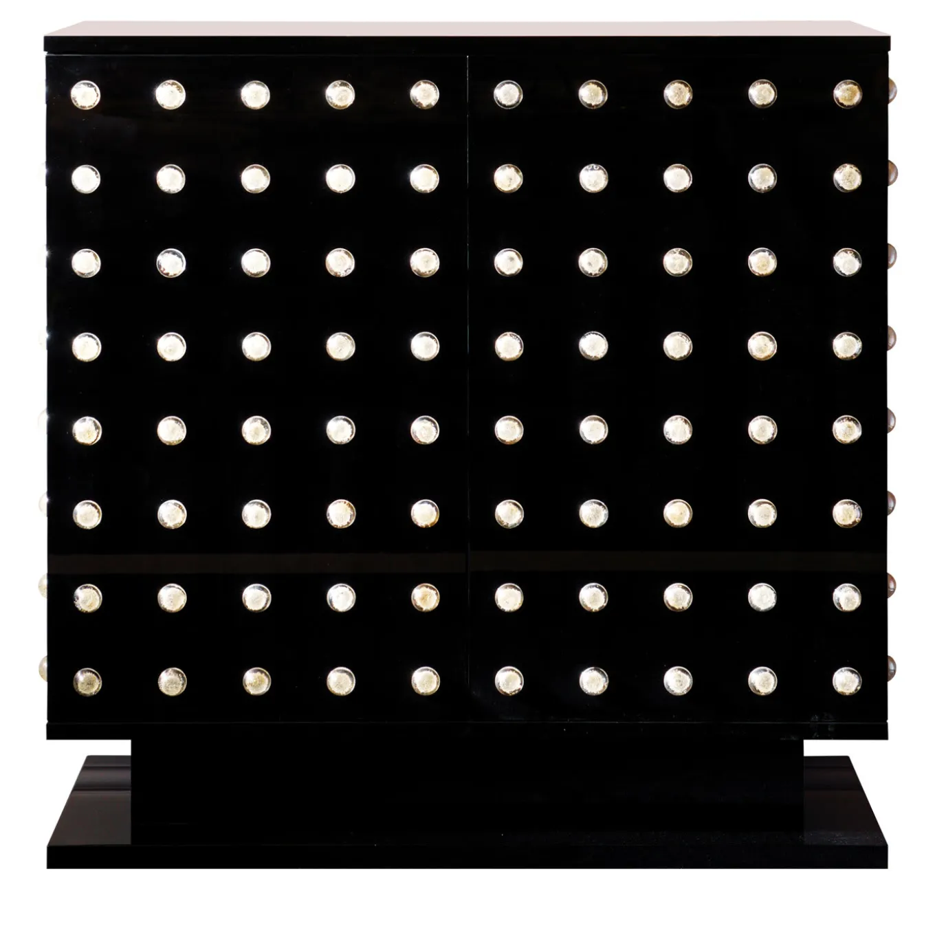 L’aspetto straordinario di questo superbo mobile in legno si ottiene aggiungendo alle due ante frontali laccate nere 144 elementi in vetro semisferico. Aggiungendo alla rigorosa decorazione una qualità eterea, questo sorprendente oggetto d’arredo funzionale sarà il punto focale di un soggiorno o di una sala da pranzo, fornendo al contempo un prezioso e versatile spazio di archiviazione, con il suo interno diviso da due ripiani anch’essi in finitura laccata lucida. L’elegante base a zoccolo completa questo design unico.