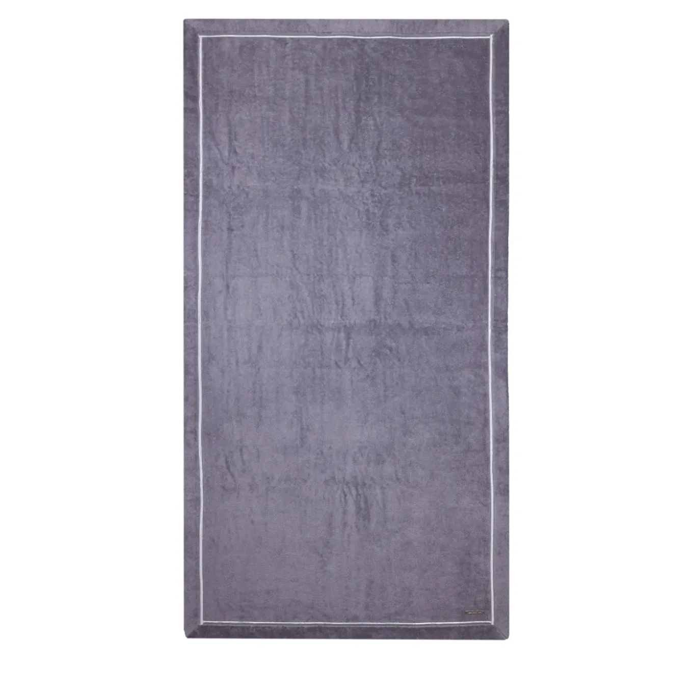 Questo elegante telo mare grigio piombo è realizzato in cotone egiziano della migliore qualità, impreziosito da un nastro argentato ricamato in filo di Lurex che corre lungo il suo perimetro. La targhetta metallica con il logo è stata impressa e presenta una finitura in palladio.