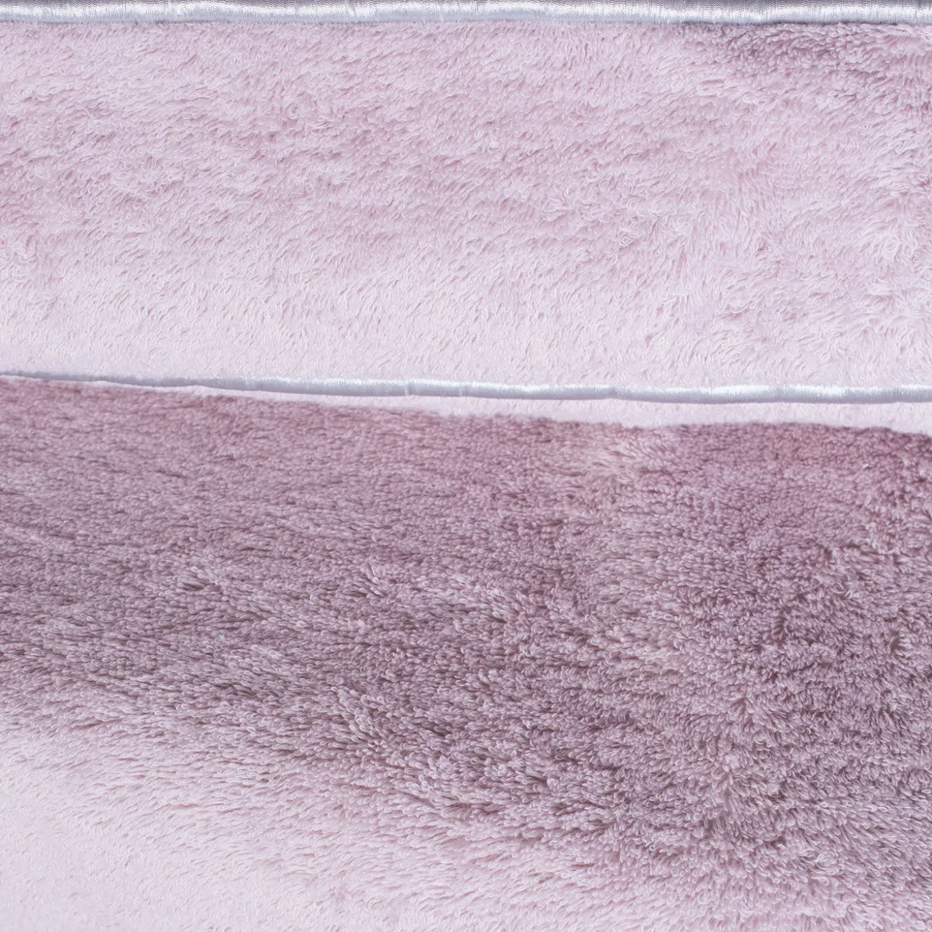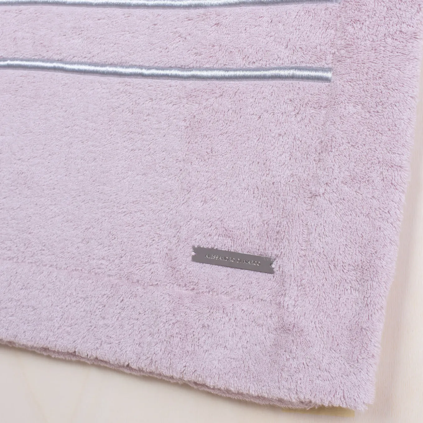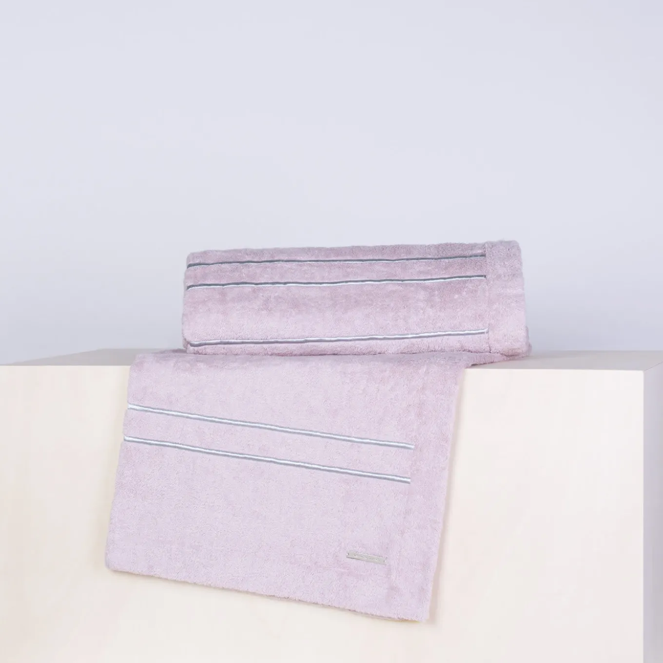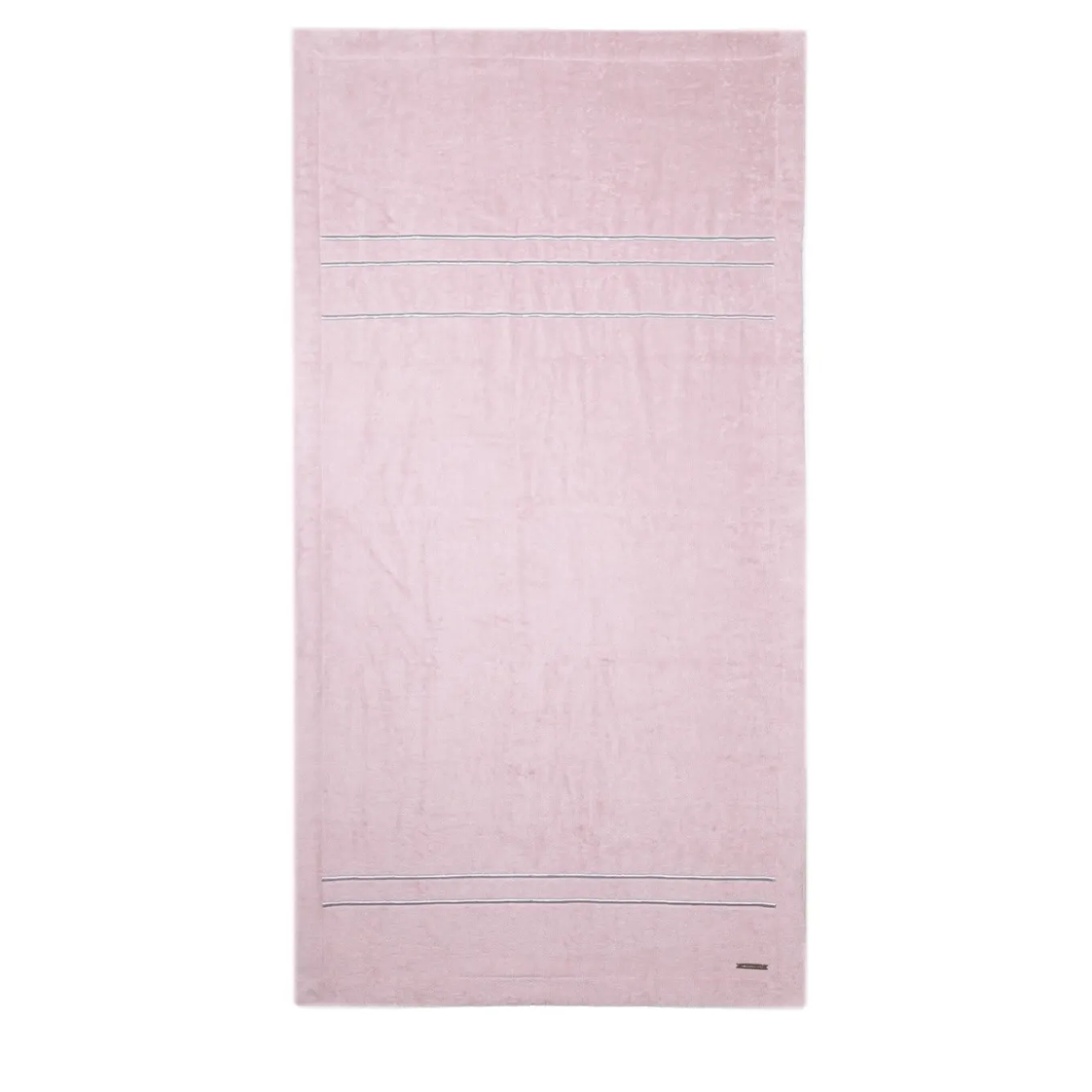 Questo elegante telo mare rosa cipria è realizzato in cotone egiziano della migliore qualità, impreziosito da cinque ricami argentati in filo di Lurex che ne attraversano la superficie. La targhetta metallica con il logo è stata impressa e presenta una finitura in palladio.