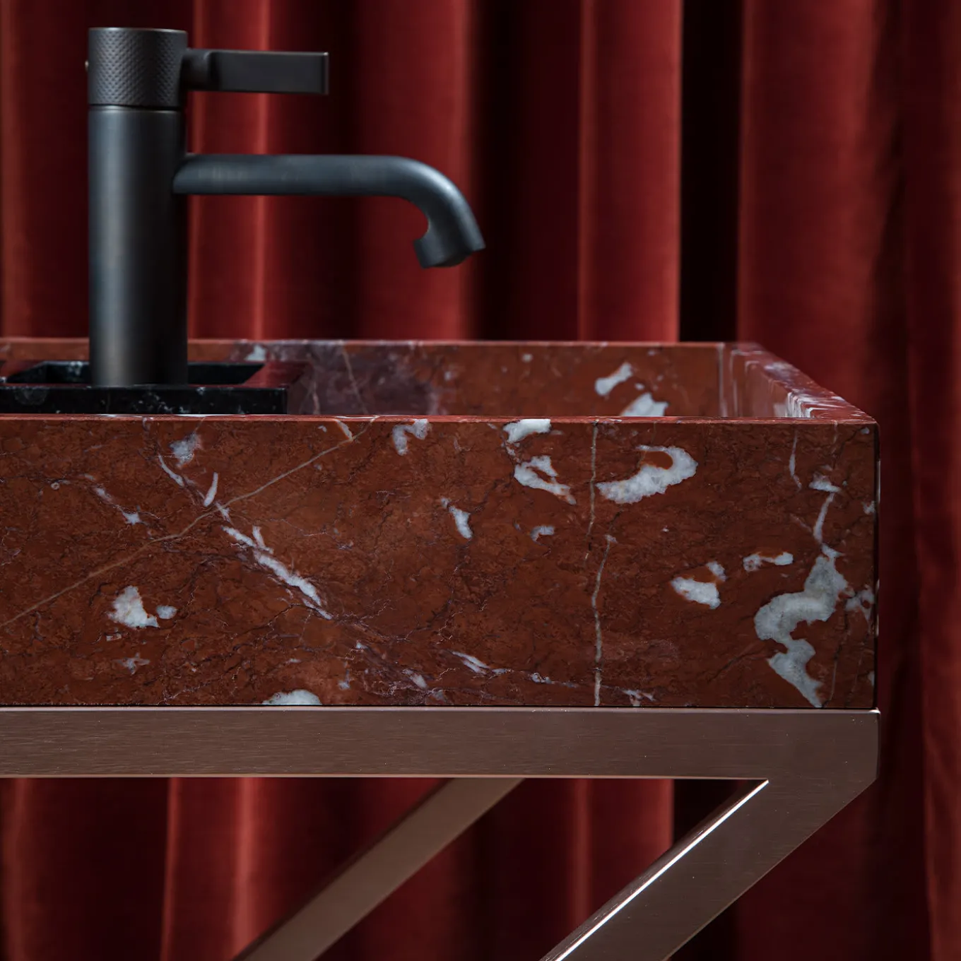 Questo straordinario pezzo di artigianato e design in marmo è un oggetto d’arte unico per qualsiasi bagno elegante contemporaneo o tradizionale. Presenta uno squisito lavabo in marmo Rosso Francia, che ospita tre vassoi interni più piccoli in marmo Nero Marquinia per panni e saponi. Questo splendido lavabo poggia su uno splendido supporto metallico in rame satinato, che ospita un vassoio in marmo Giallo Siena, funzionale ma di grande effetto, per riporre gli asciugamani.