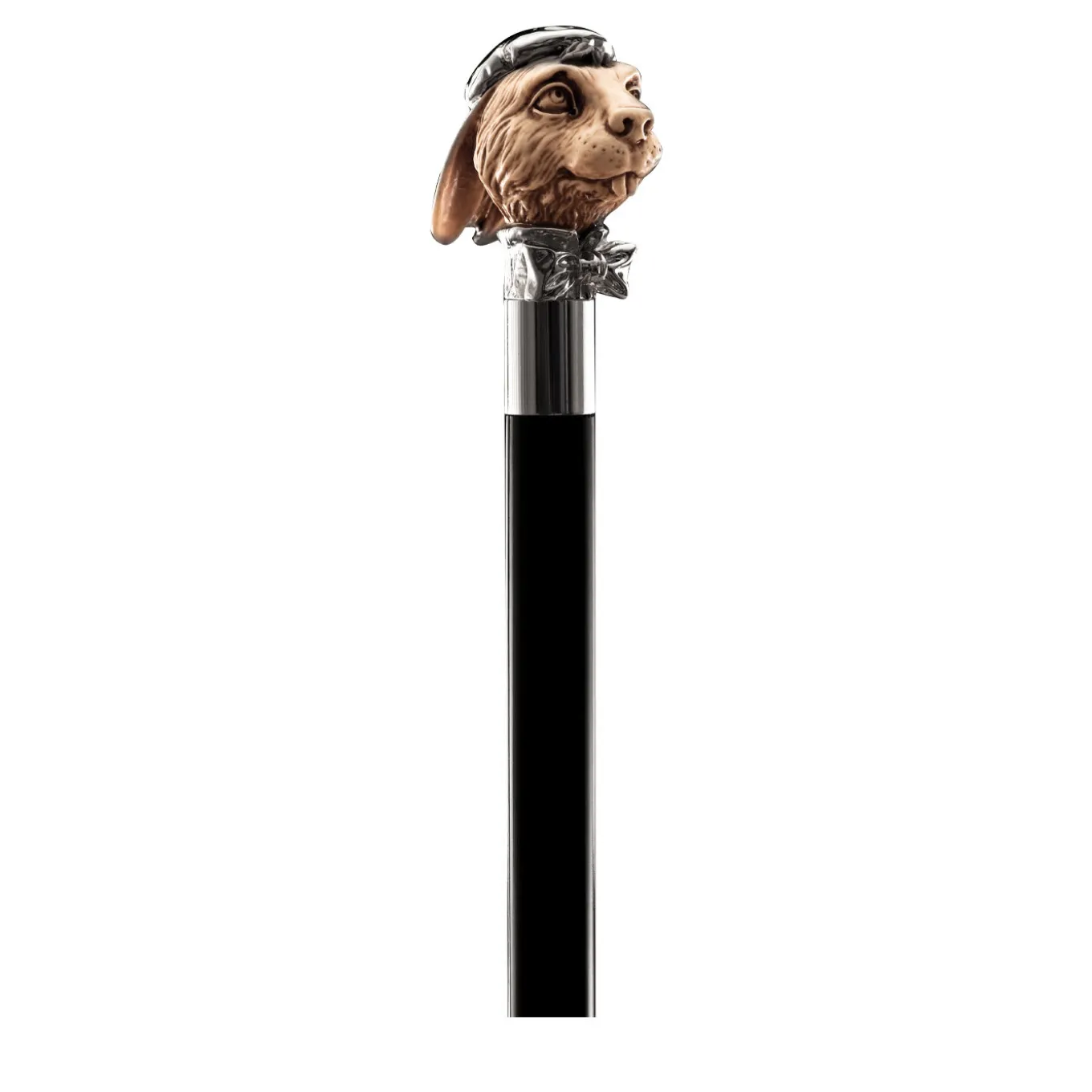 Caratterizzato da un design elegante e classico, questo bastone presenta un manico in metallo riccamente decorato con eleganti motivi in rilievo sulla superficie. L’asta conica di questo sofisticato accessorio è realizzata in legno di faggio nero lucido e presenta una punta in ottone argentato con estremità protettiva in gomma. Si tratta di un oggetto da collezione, da non utilizzare per camminare.
