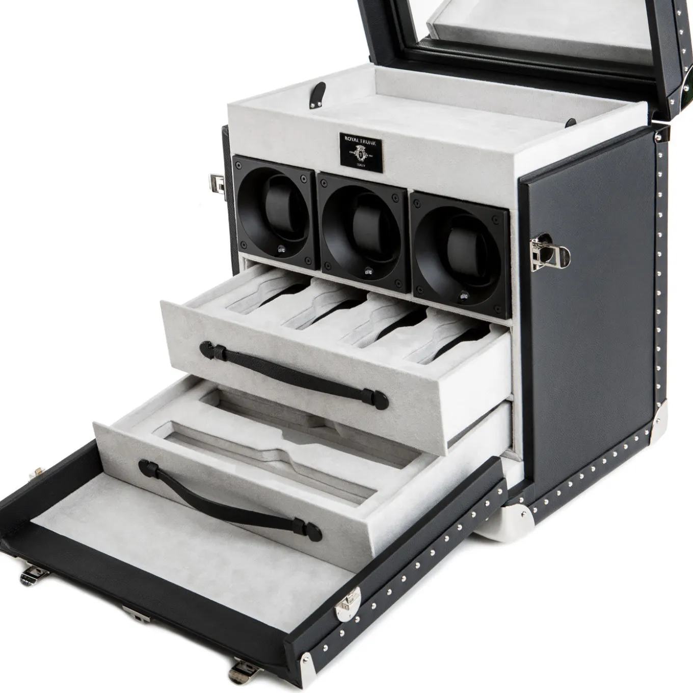 Questo raffinato beauty case creato sia per uomo che per donna presenta un esterno in pelle con maniglie in ottone e decorato con chiodi fatti a mano lungo tutto il suo perimetro. L’interno è rivestito in microfibra con uno specchio fisso nella parte superiore e un vassoio estraibile, due cassetti completamente attrezzati per riporre gioielli e orologi e tre rotori per orologi Swiss Kubic, specificamente progettati per gli orologi automatici e di fabbricazione svizzera; questi rotori sono un caricatore all’avanguardia e funzionano con batterie normali.