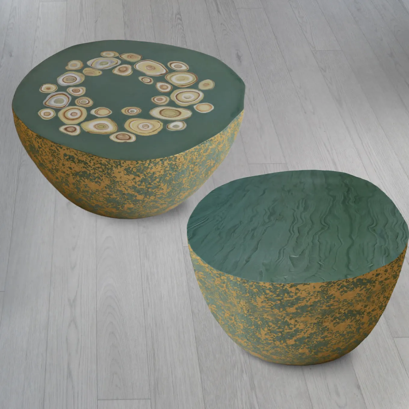 Un ipnotizzante motivo a puntini che evoca colorate murrine intrappolate nel prezioso vetro di Murano caratterizza questo tavolino della collezione BonBon. I contrasti testuali e cromatici conferiscono al tavolino la sua particolare vivacità, affermata dalla texture decorativa e grossolana dei fianchi, esaltata dal raffinato motivo oro sfumato. Ogni pezzo è fatto a mano e unico.