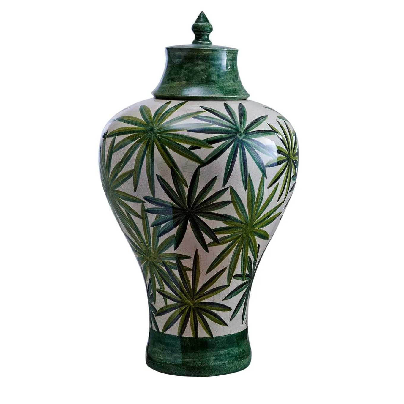 Una vetrina di abile artigianato, questa raffinata potiche in ceramica unisce l’eleganza sinuosa di un design tradizionale al carattere moderno di un motivo ispirato alla giungla. Sia la base che il coperchio svasato con terminale appuntito sono dipinti in verde pieno con pennellate visibili, evidenziando la natura manuale del processo di lavorazione, che si ritrova anche nel motivo delle foglie di palma che si estendono lungo la generosa silhouette.