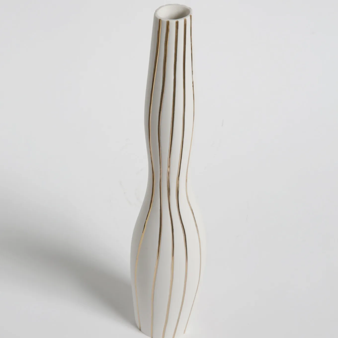 In questa raffinata bottiglia di porcellana, il design minimalista, ispirato alle figurine antropomorfe, è in porcellana non smaltata, o “biscotto”, arricchito da preziosi dettagli in oro 23k applicati a mano che corrono verticalmente lungo l’esterno del vaso e lo rendono un sorprendente oggetto d’arte.