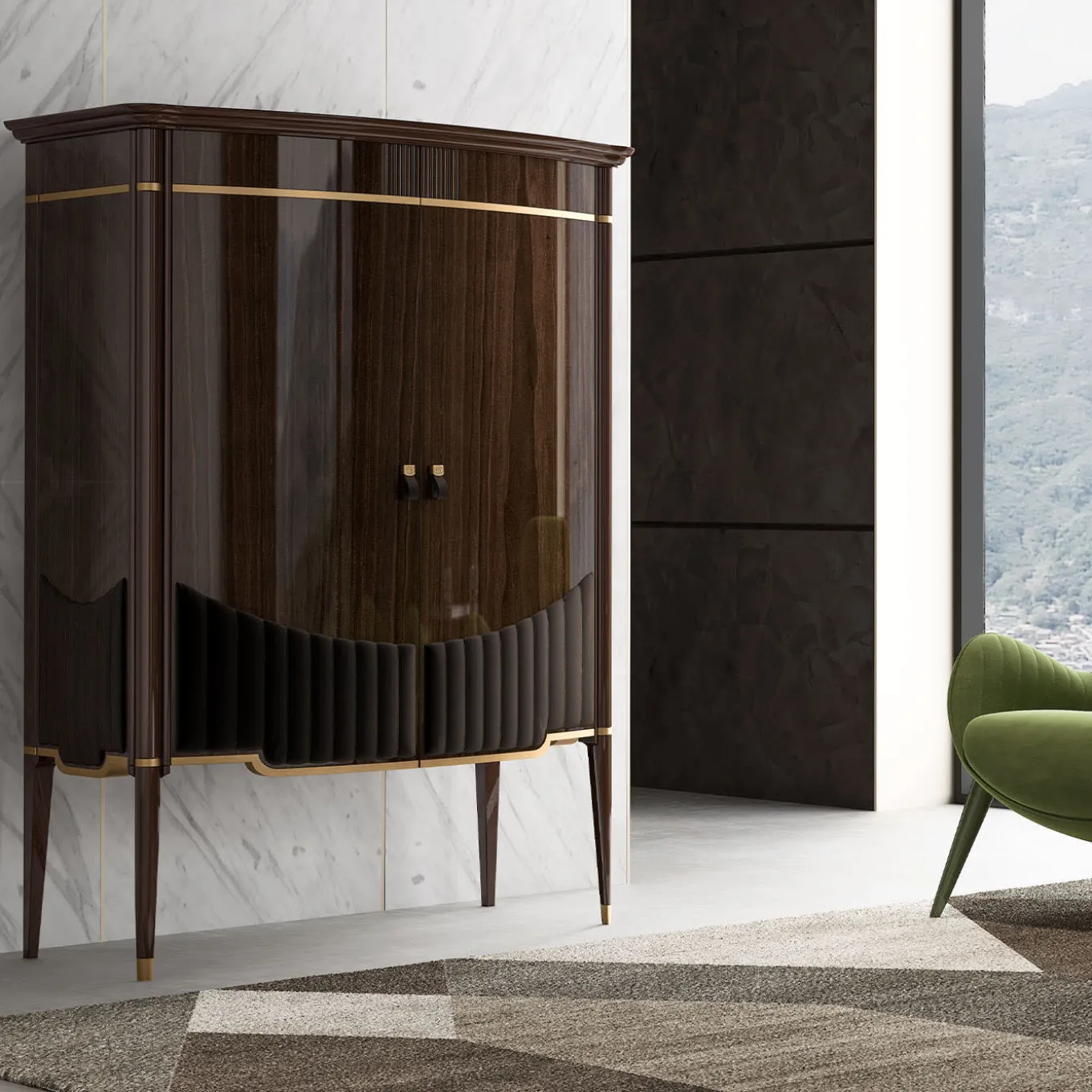 Raffinato contenitore per liquori e bicchieri pregiati, questo mobile bar è un gioiello di ebanisteria che sfoggia raffinati dettagli sartoriali. La pelle tecno-nubuck marrone è utilizzata per le maniglie ad anello che equipaggiano le due ante e adorna anche la zona inferiore delle ante e dei fianchi con un elegante disegno trapuntato a canali. Gli inserti metallici sottolineano la finitura lucida generale. Le luci a LED sono incastonate internamente.
