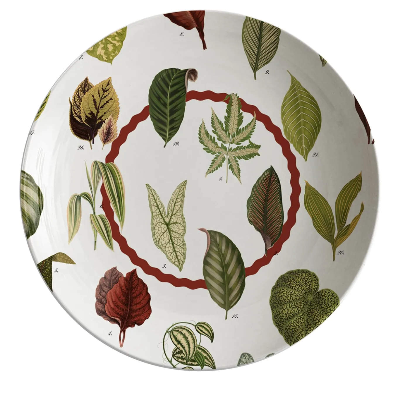 Idealmente abbinato al piatto da portata e al piatto da pranzo della serie Leaves della collezione Cabinet de Curiosités, questo piatto da minestra in ceramica sarà un’aggiunta unica e iconica a un ambiente contemporaneo. Sapientemente lavorato a mano, è decorato con una serie di foglie di ispirazione botanica e un intrigante cerchio bordeaux ondulato al centro.