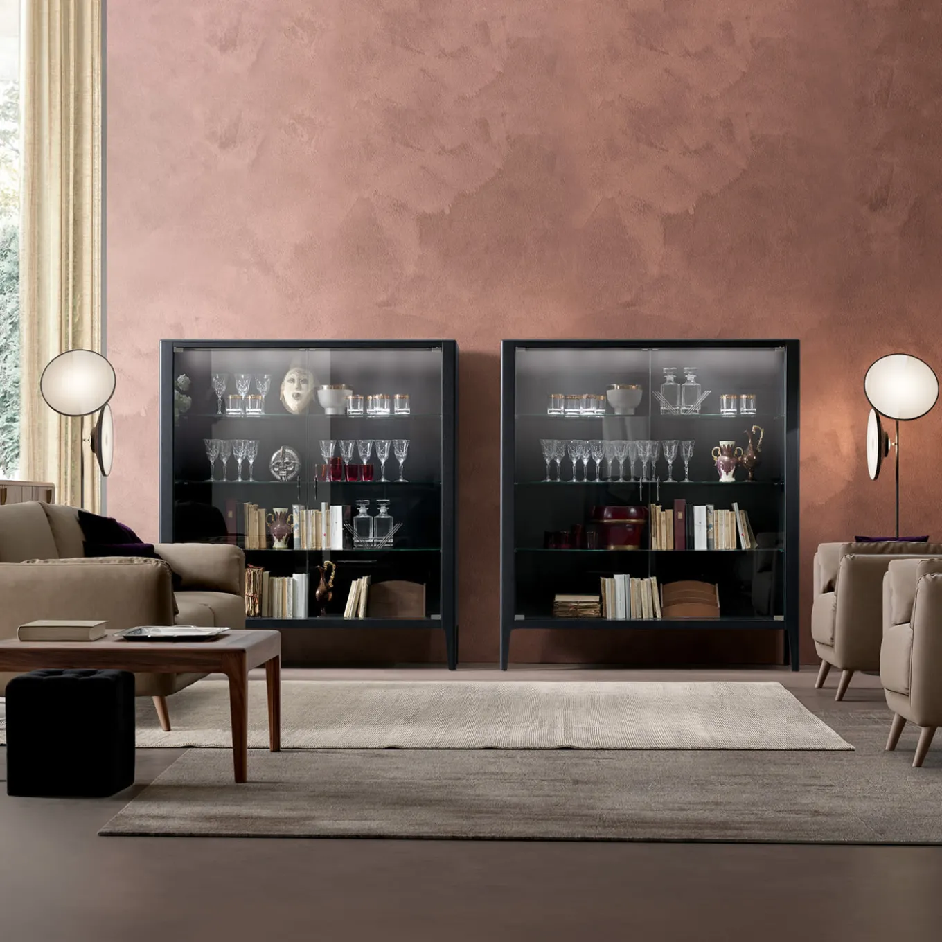 Questa vetrina, che si distingue per la sua compattezza, qui proposta in una sofisticata vernice antracite a base d’acqua, è un esercizio di linee slanciate ed eleganti trasparenze. Tre ripiani in vetro compongono il generoso mobile contenitore, che si rivela completamente attraverso le due ampie ante in vetro dotate di metallo con finitura grigio canna di fucile. È possibile aggiungere un sistema di illuminazione a LED contattando il Concierge.