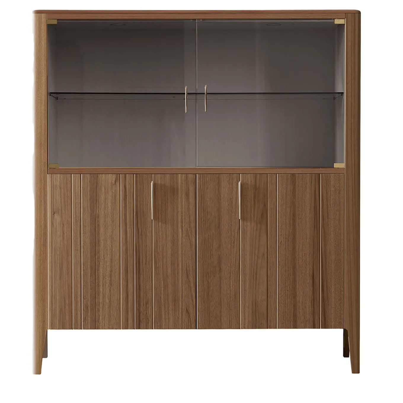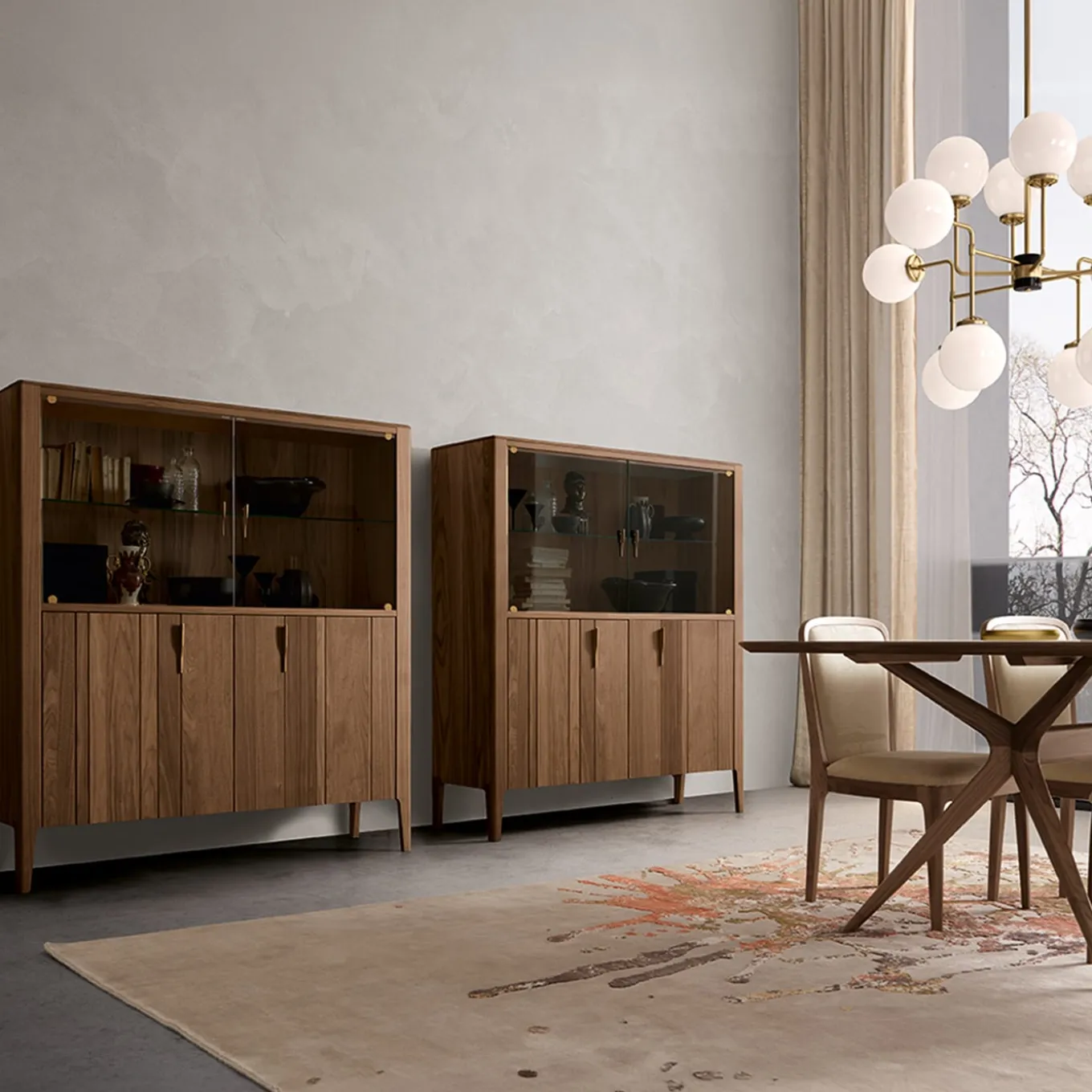 Presentata in una raffinata finitura sabbiata all’acqua, questa preziosa vetrina in noce canaletto è una superba sintesi di eleganza e robustezza. Le maniglie minimaliste in bronzo equipaggiano sia le ante in vetro fumé – che rivelano un ampio mobile organizzato in due ripiani in vetro – sia quelle in legno della base, che sfoggiano particolari scanalati di immancabile eleganza. Per un sistema di illuminazione a LED opzionale, contattare il Concierge.