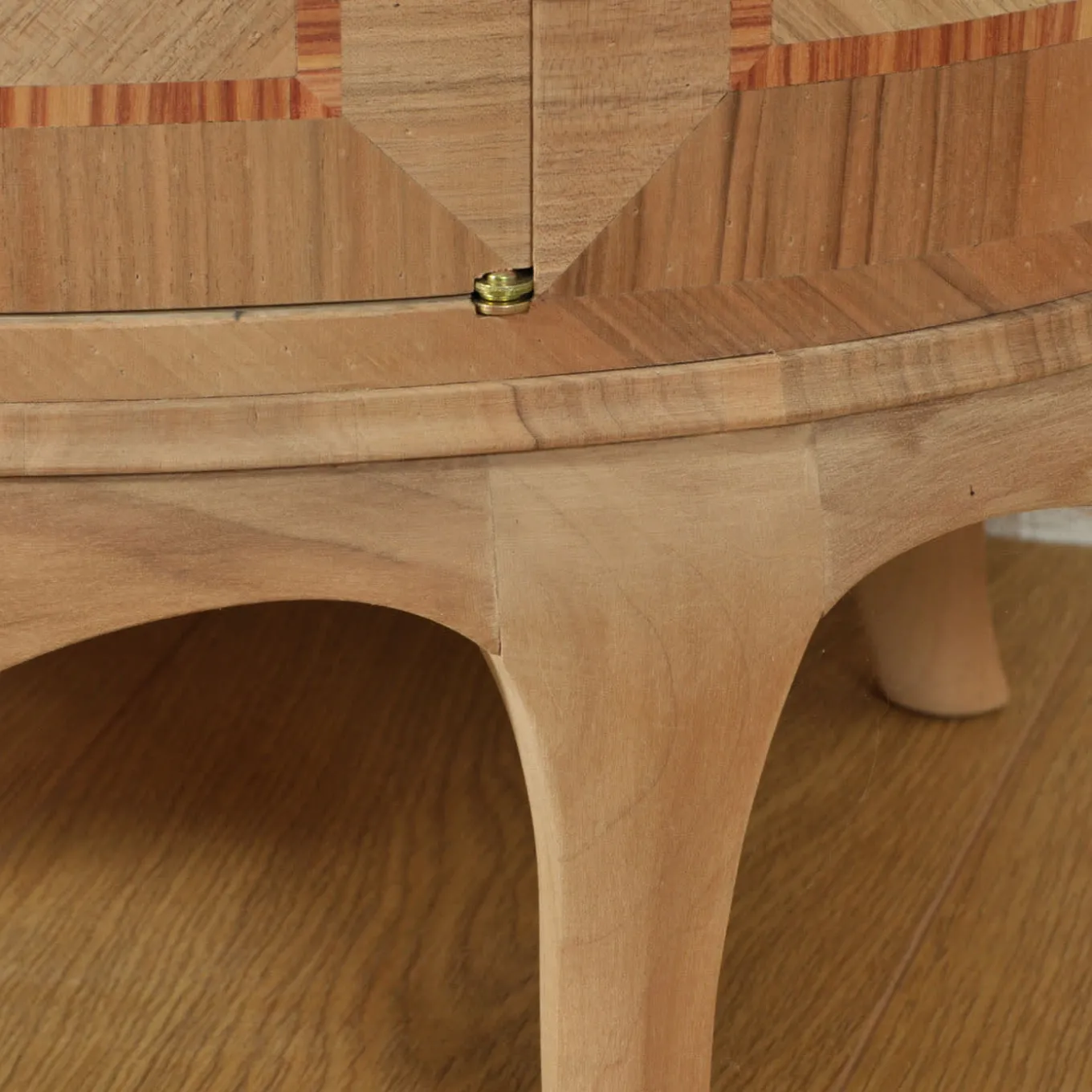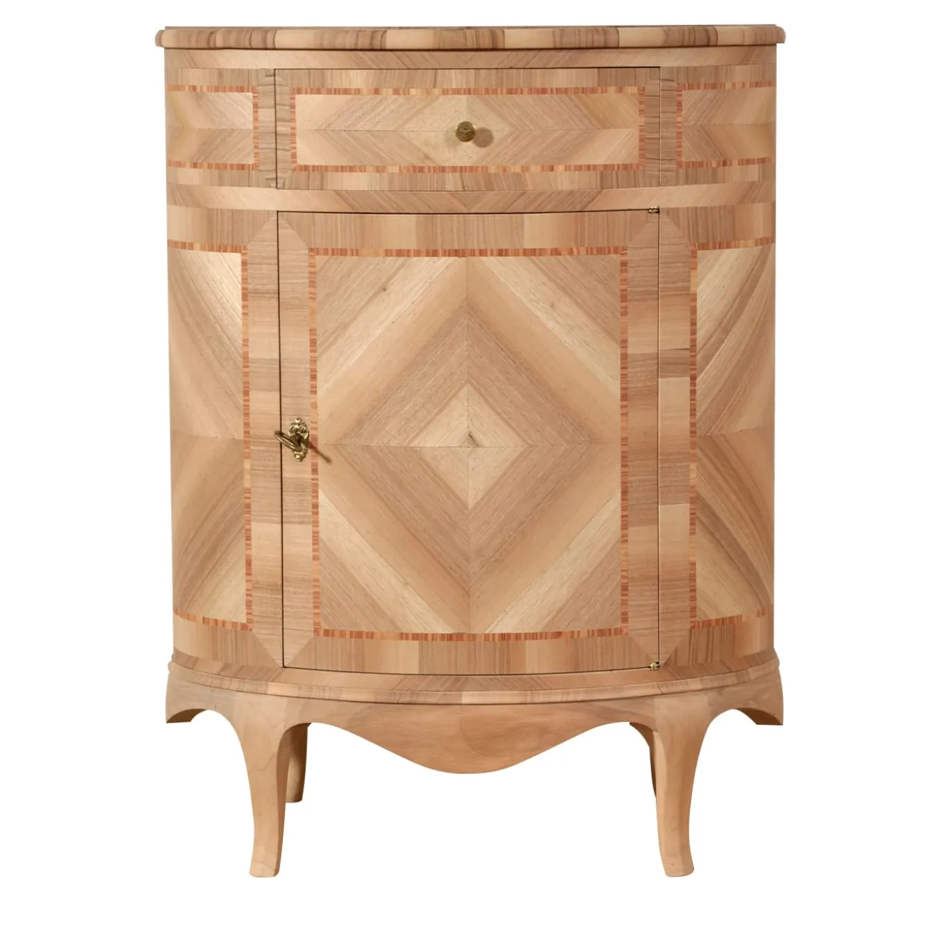 Parte della Collezione Venezia ‘700 Luigi XV, questo mobile è un pezzo singolare capace di ipnotizzare con i suoi superbi intarsi geometrici che combinano il pregiato Bois de Rose e il noce a spina di pesce. Graziosi piedi cabriole sostengono la struttura, che sfoggia un armonioso e fresco taglio ovale che conferisce al pezzo un tocco di modernità. Proposto in una raffinata finitura naturale, è minuziosamente lavorato a mano secondo tecniche antiche.
