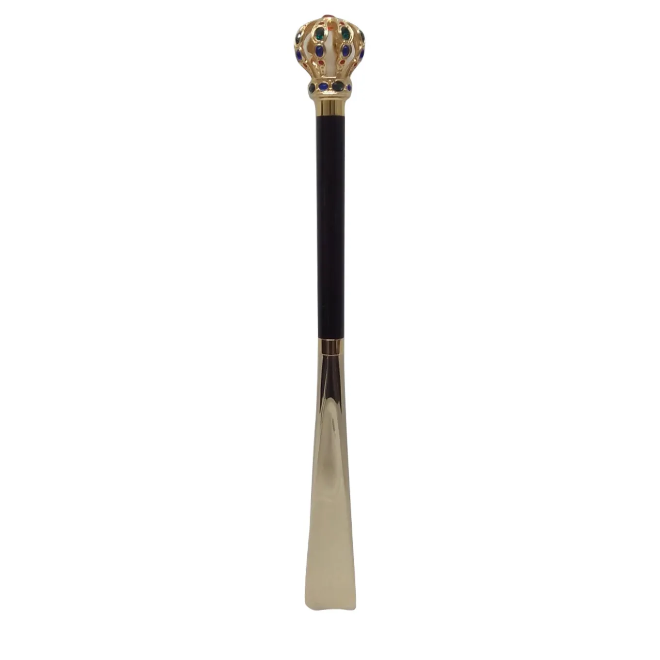 Un manico in ottone magnificamente elegante caratterizza questo calzascarpe Crown elegantemente realizzato a mano e impreziosito da preziosi cristalli Swarovski. Sofisticato e funzionale, presenta un fusto nero lucido e una finitura dorata sulla parte inferiore in ABS. Un accessorio squisito per una collezione di scarpe di classe.