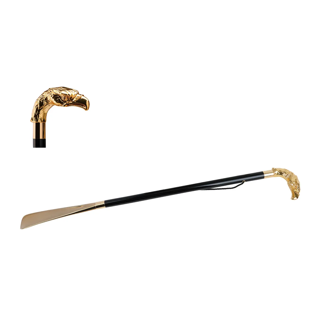 Questo calzascarpe artigianale è un accessorio di lusso perfetto per gli appassionati di scarpe. È caratterizzato da un profilo sottile e da un manico ergonomico in polvere di marmo dorato a forma di feroce testa d’aquila, il cui aspetto luminoso è abbinato alla paletta in ABS dorato e agli anelli in ottone dorato che la tengono in posizione insieme all’asta in faggio laccato nero lucido. Completano il design una custodia con marchio e un passante integrato per appenderlo facilmente.