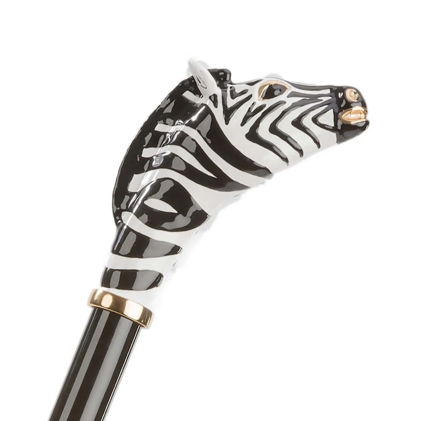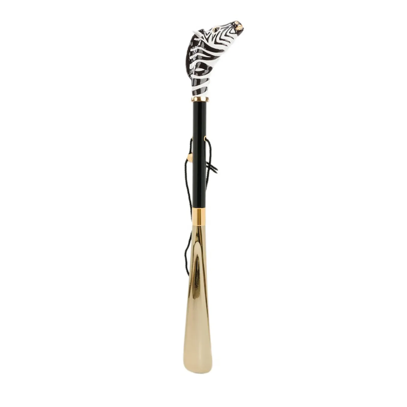 Il calzascarpe Zebra è un accessorio di grande effetto, con manico in ottone smaltato a forma di testa di zebra, fusto in legno e terminale in ABS. Di colore bianco e nero con finiture in ottone, il calzascarpe è lungo 50 cm ed è realizzato a mano in Italia.