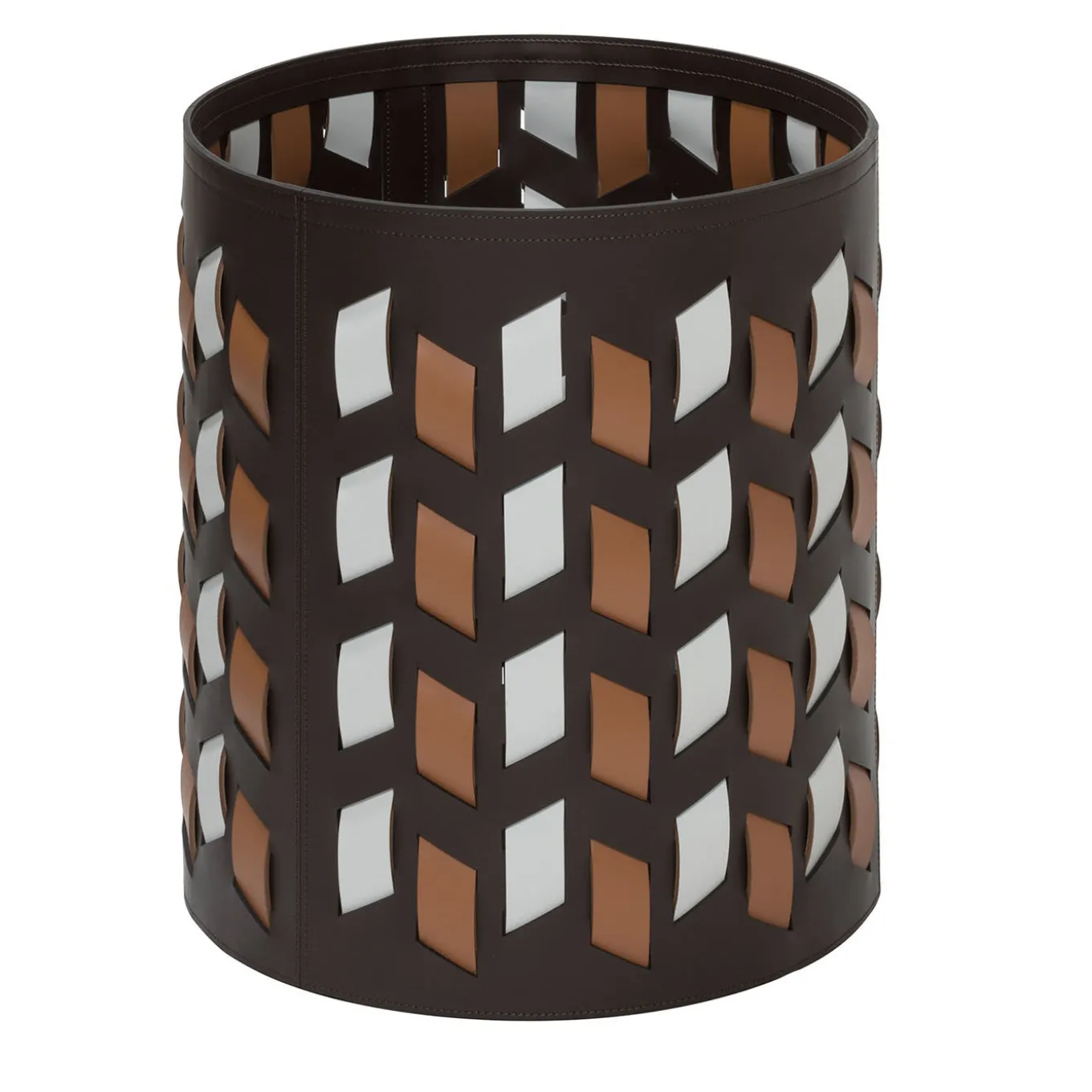 I cestini Cancun sono caratterizzati da una trama che si sviluppa solo attraverso linee verticali tratteggiate che, essendo tagliate in diagonale, danno vita a un disegno che ricorda le atmosfere calde e retrò di certi tessuti tipici del Centro America. Struttura in finissima pelle rigenerata rinforzata con finitura impermeabile e resistente ai raggi UV. Base inferiore in gomma impermeabile e antiscivolo. Adatta sia per uso interno che esterno. Sono disponibili altri colori. Chiedere al Concierge per i dettagli.