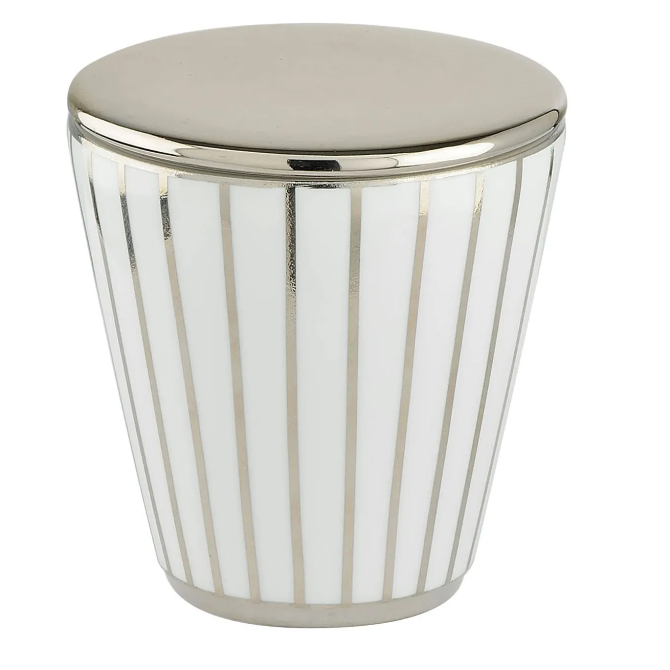 Questa sofisticata candela sarà un’aggiunta altrettanto deliziosa a sofisticati tavolini da caffè o bordure da bagno. Il contenitore a forma di V in fine porcellana bianca è squisitamente ornato da un motivo scintillante di strisce verticali di platino, lo stesso metallo prezioso che ricopre il coperchio circolare e piatto con bordi levigati che sigillano il pezzo.