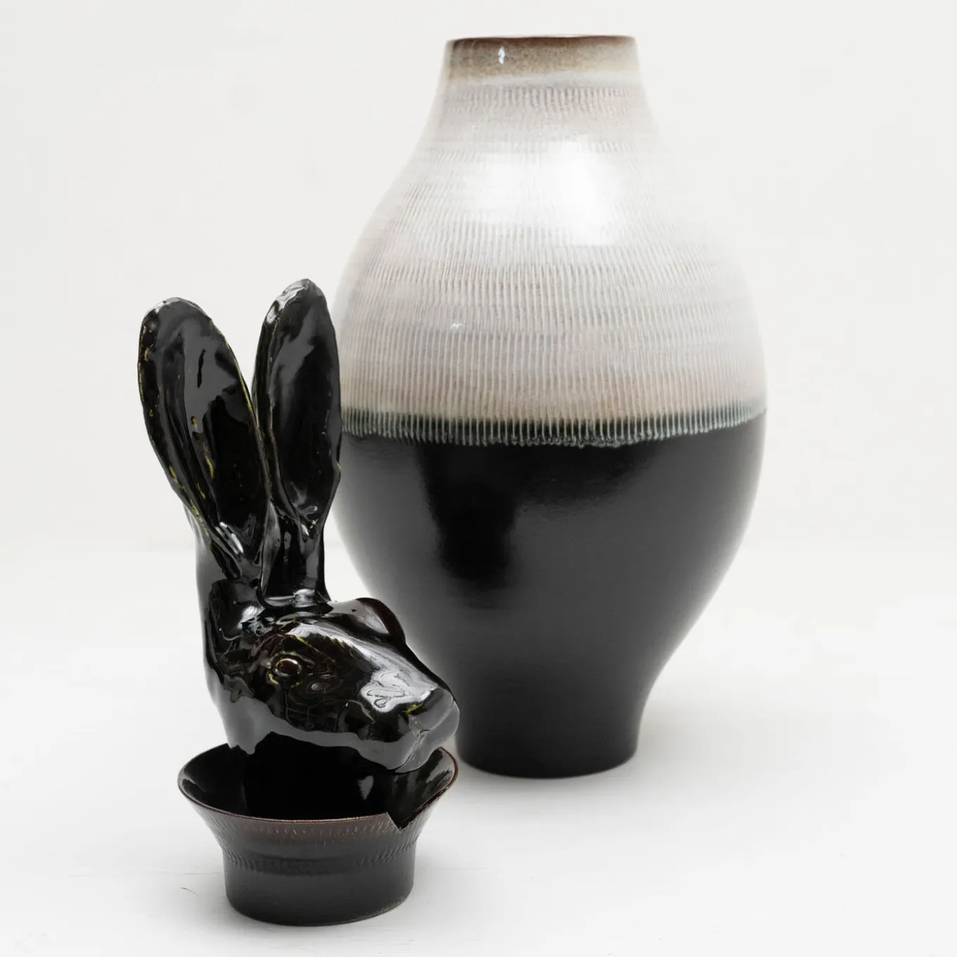 Questo vaso si ispira direttamente ai vasi canopi egizi; è una reinterpretazione ironica e contemporanea di un oggetto ancestrale, nume tutelare della quiete domestica. Il coniglio è infatti un simbolo di abbondanza, prosperità e longevità e più semplicemente un bellissimo animale. Realizzata a mano e smaltata con ossidi e cristalli, l’opera diventa un oggetto prezioso e scultoreo.