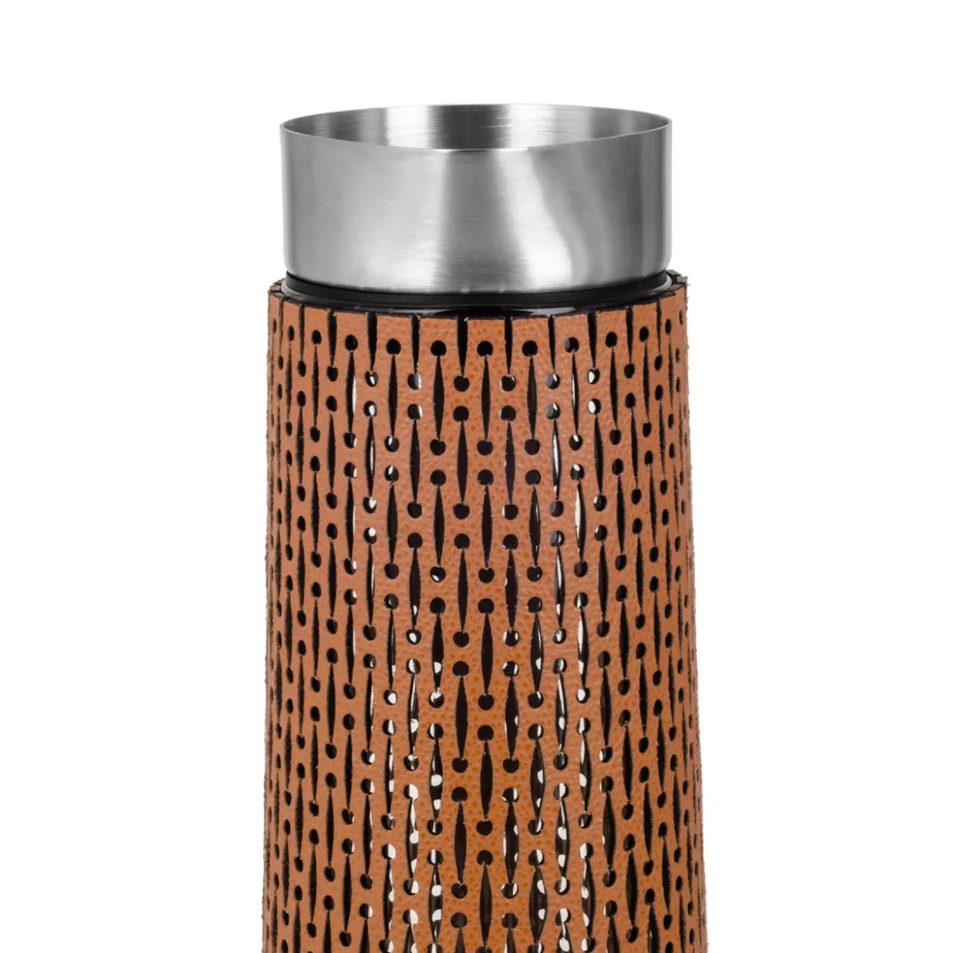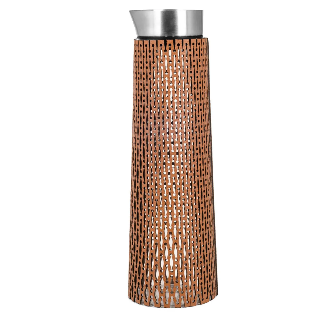Un modo sofisticato di servire le bevande, questa splendida caraffa completerà l’arredamento di un ufficio o una moderna collezione di utensili da cucina. Caratterizzata da una silhouette sottile e affusolata che si restringe fino al beccuccio in metallo, è interamente realizzata in vetro trasparente e avvolta da un lussuoso rivestimento in pelle (rimovibile) squisitamente ornato da un disegno traforato tagliato al laser. Può contenere fino a 1,5 litri, ma è disponibile anche in una variante più piccola che può contenere al massimo 1 litro.
