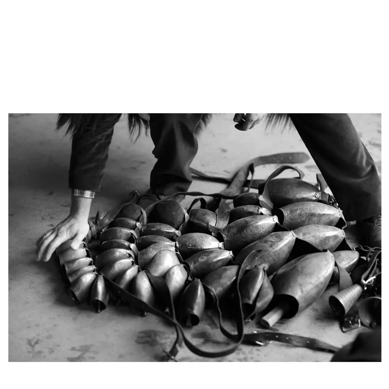 Ritenute espressione del legame tra un pastore e il suo gregge, le campane raffigurate in questa foto sono indossate dai Mamuthones sulla schiena durante il carnevale tradizionale di Mamoiada, in Sardegna. La loro funzione è quella di allontanare gli spiriti maligni all’inizio della primavera. La cornice non è inclusa nell’acquisto. Si prega di consultare il Concierge per le varianti di taglia disponibili.