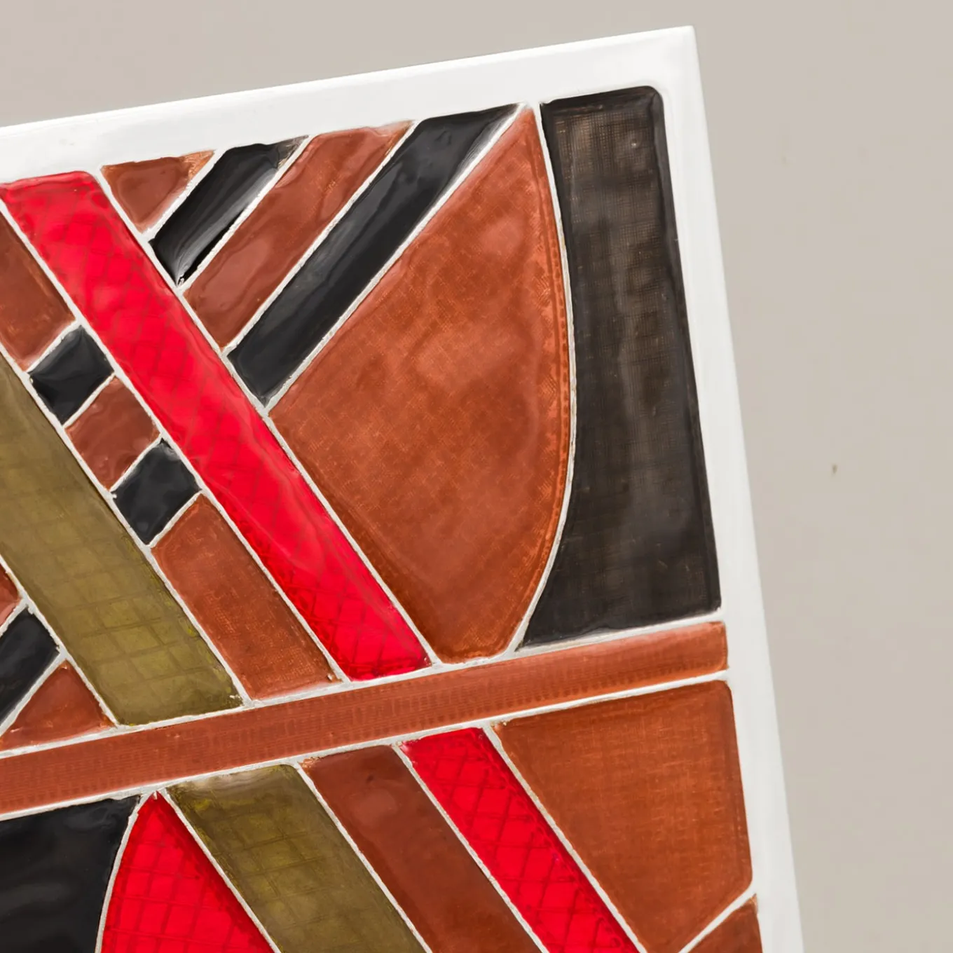 In un’atmosfera di fascino industriale, un’audace cornice di ferro accoglie la piccola “piastrella” su cui si concentra questo pezzo decorativo. La tecnica Cloisonné – in cui gli smalti vengono versati nelle celle in cui si articolano le filigrane di metallo – è qui seguita con cura, dando vita a un intrigante motivo dai toni profondi che emerge dall’argento precedente. Risalente all’antico Egitto, questa tecnica conferisce ulteriore valore al pezzo.