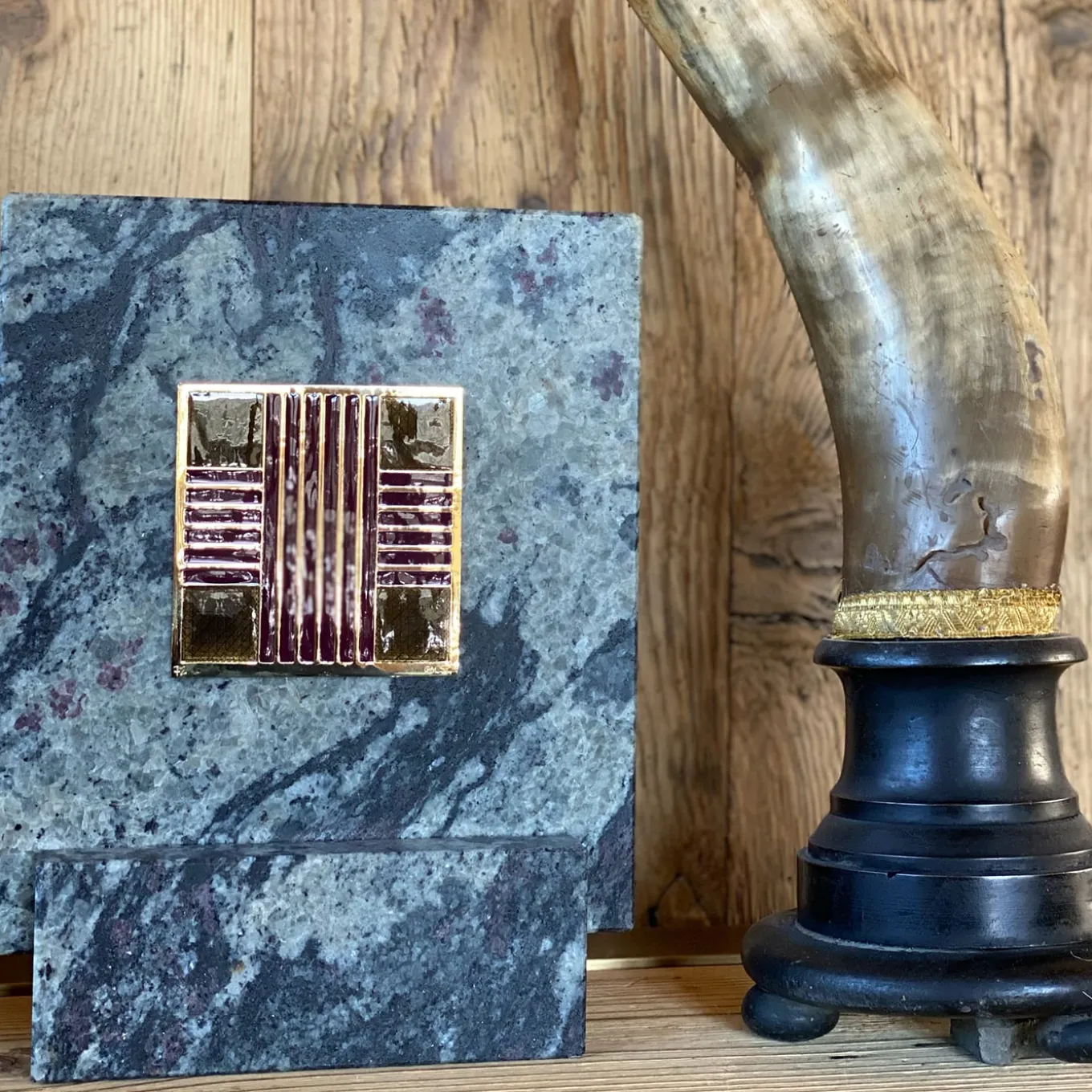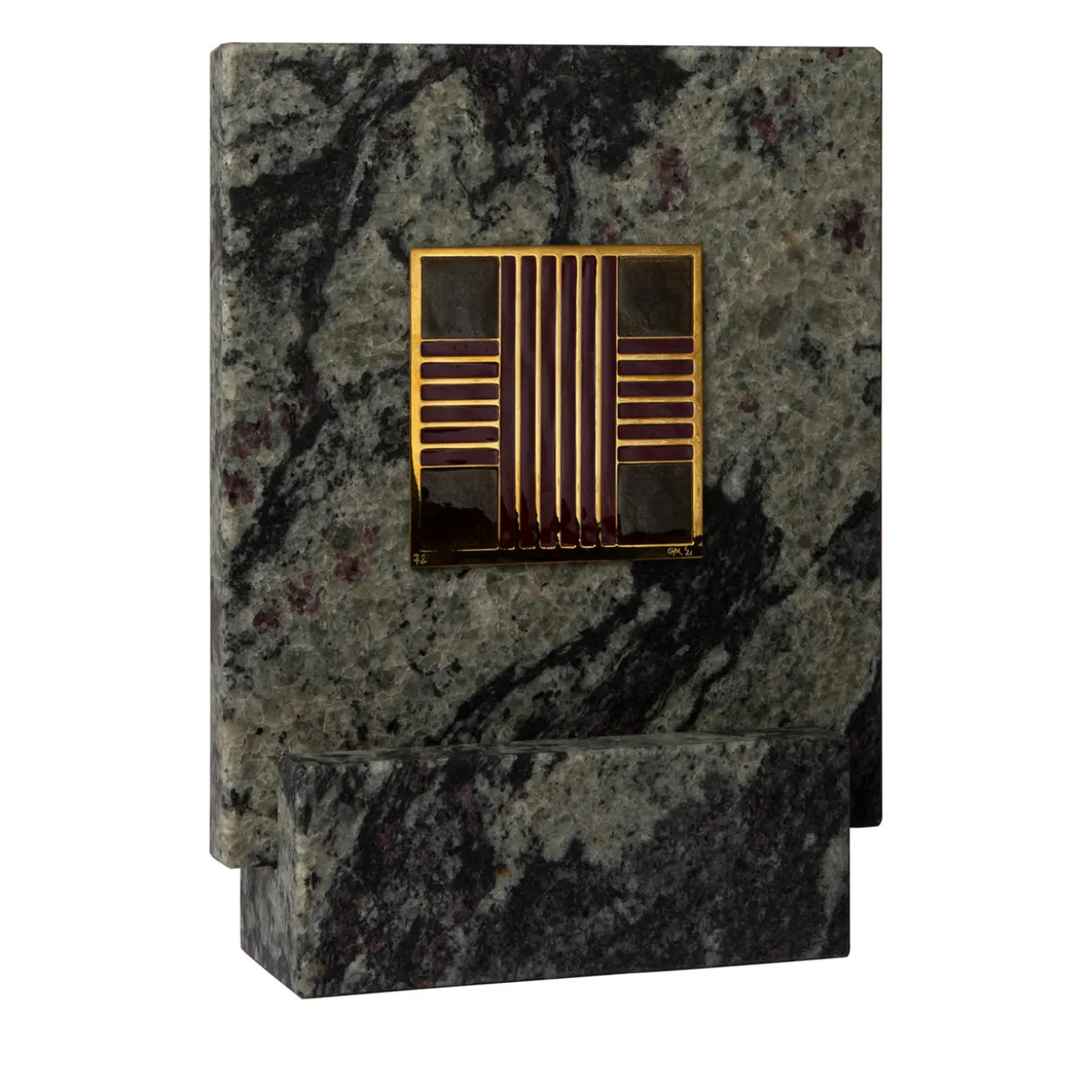 La tecnica Cloisonné, che risale all’antico Egitto e che impiega strisce o filigrane di metallo per creare celle in cui vengono versati gli smalti, è alla base di questo sublime pezzo decorativo simile a una piastrella. Incastonata in una pregiata cornice di marmo Piracema Granito, la “piastrella” è ottenuta da smalto e ottone in un accattivante disegno a croce. Realizzato minuziosamente a mano, ogni pezzo è unico.