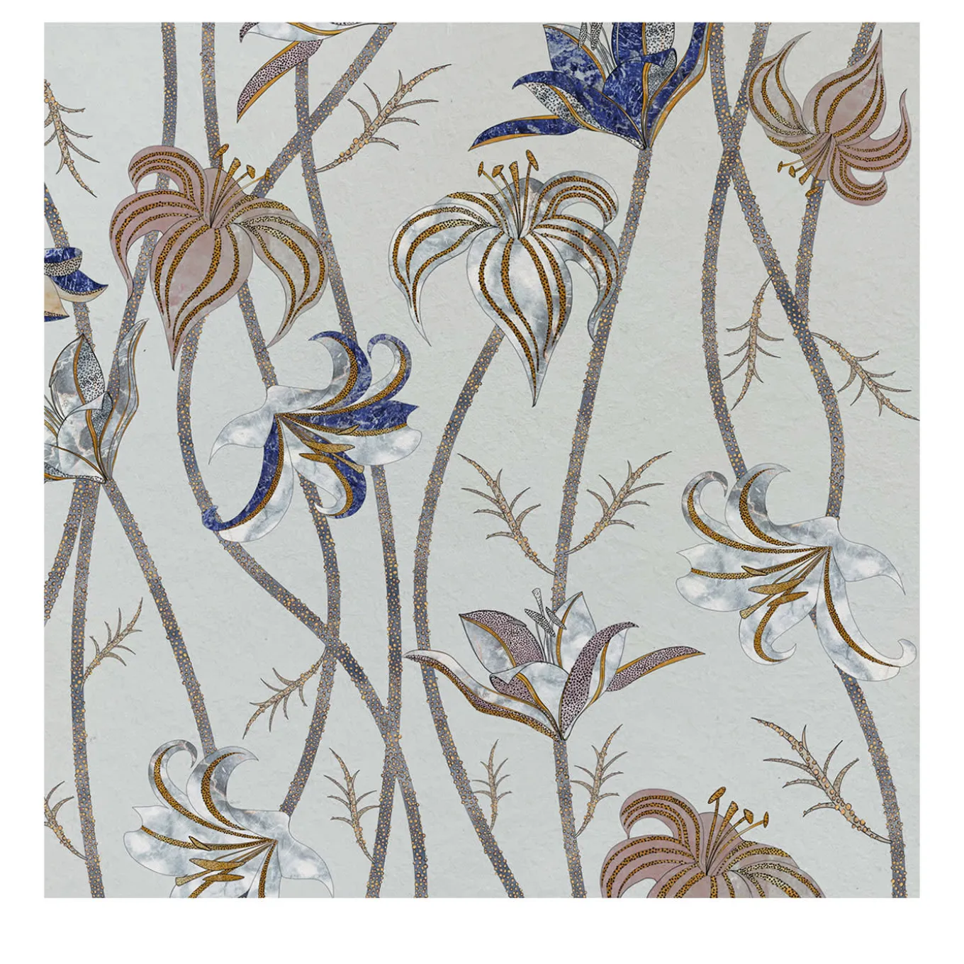 Steli sottili e lunghissimi corrono lungo tutta la parete, per terminare come fiori leggerissimi di Lilium Lancifolium, meglio conosciuto come Giglio di Tigre. Osservando attentamente i disegni di questi fiori, è possibile scorgere colori e texture che fanno parte di un’altra realtà: l’antica tecnica denominata Scagliola, l’Arte della Luna. La carta da parati Fiori è liberamente ispirata a questa antichissima arte, che consisteva nella sapiente lavorazione del gesso. Questo veniva poi utilizzato per sostituire materiali più preziosi.