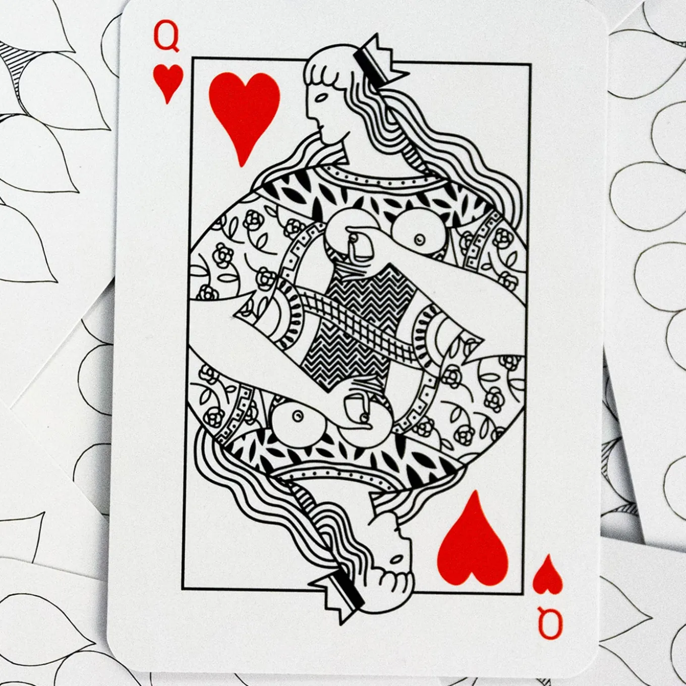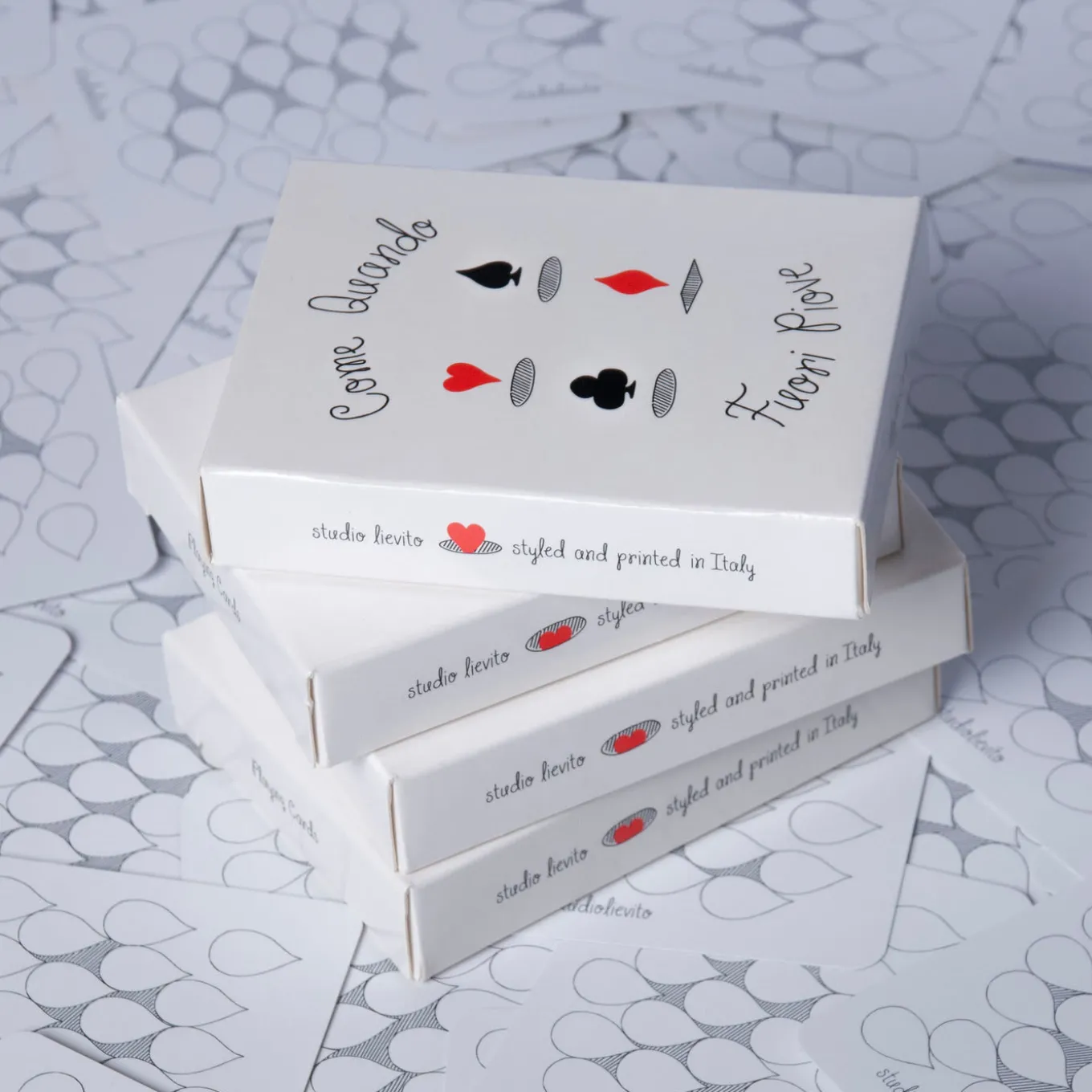Compagno essenziale dell’astuccio in marmo Comequandofuoripiove, questo mazzo di 54 carte da gioco francesi è stato stampato in Italia su carta duplex da Modiano, marchio iconico italiano leader nella stampa della carta e nella produzione di carte da gioco. Un semplice disegno a forma di lacrima in grigio con la scritta Studio Lievito adorna il dorso delle carte, che presentano una grafica giocosa con una sequenza a scomparsa di tre immagini del seme.