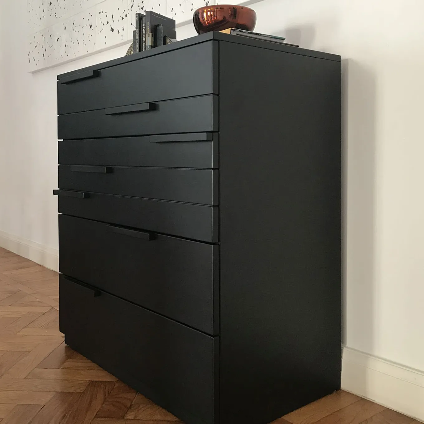 Accento elegante e senza tempo per un arredamento contemporaneo, questa cassettiera ricorda un elemento puro e naturale, abilmente realizzato in legno di olmo, disponibile anche in frassino, noce o rovere. Presenta una vivace combinazione di cassetti di diverse altezze (15 cm, 18 cm, 22 cm). Personalizzabile per dimensioni, numero di cassetti e finiture su richiesta, si prega di consultare il Concierge per ulteriori informazioni. Qui presentata con finitura laccata nero opaco.